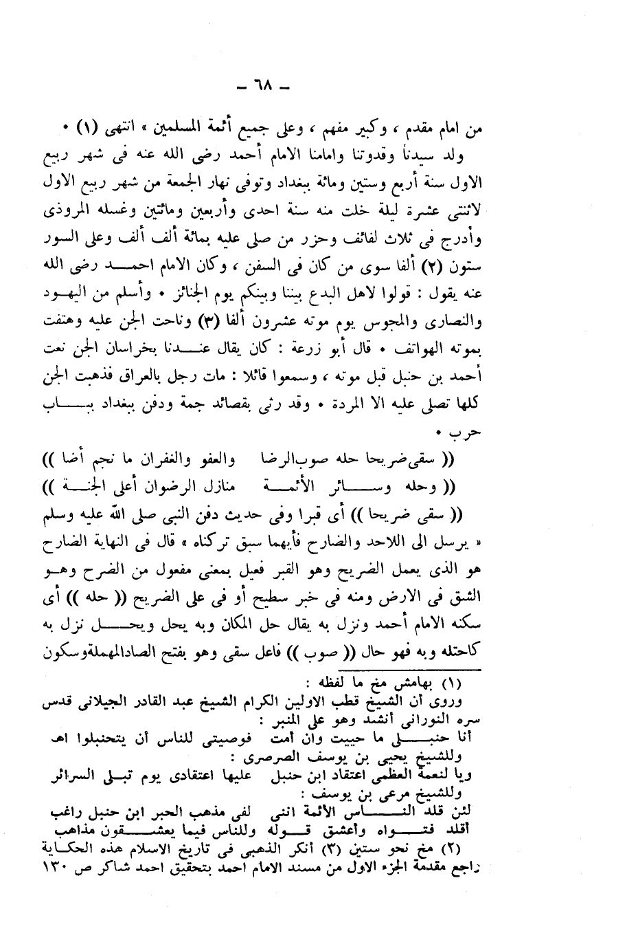وُلِدَ سَيِّدُنَا وَقُدْوَتُنَا وَإِمَامُنَا الْإِمَامُ أَحْمَدُ - رَضِيَ اللَّهُ عَنْهُ - فِي شَهْرِ رَبِيعٍ الْأَوَّلِ، سَنَةَ أَرْبَعٍ وَسِتِّينَ وَمِائَةٍ بِبَغْدَادَ، وَتُوُفِّيَ نَهَارَ الْجُمُعَةِ مِنْ شَهْرِ رَبِيعٍ الْأَوَّلِ لِاثْنَتَيْ عَشْرَةَ لَيْلَةً خَلَتْ مِنْهُ سَنَةَ إِحْدَى وَأَرْبَعِينَ وَمِائَتَيْنِ، وَغَسَّلَهُ الْمَرُّوذِيُّ، وَأُدْرِجَ فِي ثَلَاثِ لَفَائِفَ، وَحُزِّرَ مَنْ صَلَّى عَلَيْهِ بِمِائَةِ أَلْفِ أَلْفٍ، وَعَلَى السُّورِ سِتُّونَ أَلْفًا سِوَى مَنْ كَانَ فِي السُّفُنِ، وَكَانَ الْإِمَامُ أَحْمَدُ - رَضِيَ اللَّهُ عَنْهُ - يَقُولُ: قُولُوا لِأَهْلِ الْبِدَعِ: بَيْنَنَا وَبَيْنَكُمْ يَوْمُ الْجَنَائِزِ. وَأَسْلَمَ مِنَ الْيَهُودِ وَالنَّصَارَى وَالْمَجُوسِ يَوْمَ مَوْتِهِ عِشْرُونَ أَلْفًا، وَنَاحَتِ الْجِنُّ عَلَيْهِ، وَهَتَفَتْ بِمَوْتِهِ الْهَوَاتِفُ. قَالَ أَبُو زُرْعَةَ: كَانَ يُقَالُ عِنْدَنَا بِخُرَاسَانَ: الْجِنُّ نَعَتْ أَحْمَدَ بْنَ حَنْبَلٍ قَبْلَ مَوْتِهِ، وَسَمِعُوا قَائِلًا: مَاتَ رَجُلٌ بِالْعِرَاقِ فَذَهَبَتِ الْجِنُّ كُلُّهَا تُصَلِّي عَلَيْهِ إِلَّا الْمَرَدَةَ. وَقَدْ رُثِيَ بِقَصَائِدَ جَمَّةٍ، وَدُفِنَ بِبَغْدَادَ بِبَابِ حَرْبٍ.