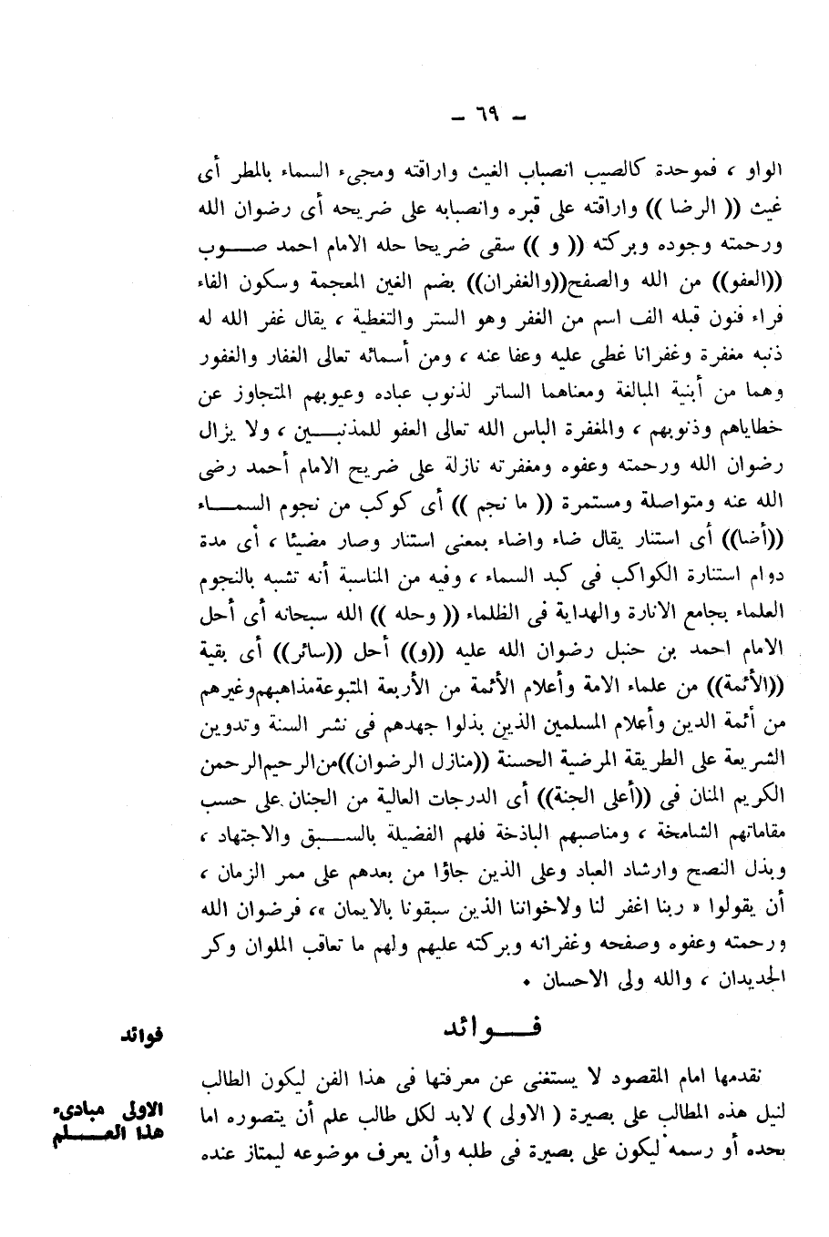 الْوَاوِ فَمُوَحَّدَةٌ، كَالصَّيِّبِ: انْصِبَابُ الْغَيْثِ وَإِرَاقَتُهُ، وَمَجِيءُ السَّمَاءِ بِالْمَطَرِ أَيْ غَيْثِ (الرِّضَا) ، وَإِرَاقَتُهُ عَلَى قَبْرِهِ، وَانْصِبَابُهُ عَلَى ضَرِيحِهِ، أَيْ رِضْوَانُ اللَّهِ وَرَحْمَتُهُ وَجُودُهُ وَبَرَكَتُهُ، (وَ) سَقَى ضَرِيحًا، حَلَّهُ الْإِمَامُ أَحْمَدُ صَوْبُ (الْعَفْوِ) مِنَ اللَّهِ وَالصَّفْحِ، (وَالْغُفْرَانِ) بِضَمِّ الْغَيْنِ الْمُعْجَمَةِ وَسُكُونِ الْفَاءِ فَرَاءٍ فَنُونٍ قَبْلَهُ أَلِفٌ، اسْمٌ مِنَ الْغَفْرِ وَهُوَ السَّتْرُ وَالتَّغْطِيَةُ، يُقَالُ: غَفَرَ اللَّهُ لَهُ ذَنْبَهُ مَغْفِرَةً وَغُفْرَانًا غَطَّى عَلَيْهِ وَعَفَا عَنْهُ، وَمِنْ أَسْمَائِهِ - تَعَالَى - الْغَفَّارُ وَالْغَفُورُ، وَهُمَا مِنْ أَبْنِيَةِ الْمُبَالَغَةِ، وَمَعْنَاهُمَا السَّاتِرُ لِذُنُوبِ عِبَادِهِ وَعُيُوبِهِمْ، الْمُتَجَاوِزُ عَنْ خَطَايَاهُمْ وَذُنُوبِهِمْ، وَالْمَغْفِرَةُ إِلْبَاسُ اللَّهِ - تَعَالَى - الْعَفْوَ لِلْمُذْنِبِينَ، وَلَا يَزَالُ رِضْوَانُ اللَّهِ وَرَحْمَتُهُ وَعَفْوُهُ وَمَغْفِرَتُهُ نَازِلَةٌ عَلَى ضَرِيحِ الْإِمَامِ أَحْمَدَ - رَضِيَ اللَّهُ عَنْهُ - وَمُتَوَاصِلَةٌ وَمُسْتَمِرَّةٌ (مَا نَجْمٌ) أَيْ كَوْكَبٌ مِنْ نُجُومِ السَّمَاءِ (أَضَا) أَيِ اسْتَنَارَ، يُقَالُ: ضَاءَ وَأَضَاءَ بِمَعْنَى اسْتَنَارَ وَصَارَ مُضِيئًا، أَيْ مُدَّةَ دَوَامِ اسْتِنَارَةِ الْكَوَاكِبِ فِي كَبِدِ السَّمَاءِ، وَفِيهِ مِنَ الْمُنَاسَبَةِ أَنَّهُ تَشَبَّهَ بِالنُّجُومِ الْعُلَمَاءُ بِجَامِعِ الْإِنَارَةِ وَالْهِدَايَةِ فِي الظَّلْمَاءِ، (وَحَلَّهُ) اللَّهُ - سُبْحَانَهُ - أَيْ أَحَلَّ الْإِمَامَ أَحْمَدَ بْنَ حَنْبَلٍ - رِضْوَانُ اللَّهِ عَلَيْهِ - (وَ) أَحَلَّ (سَائِرَ) أَيْ بَقِيَّةَ (الْأَئِمَّةِ) مِنْ عُلَمَاءِ الْأُمَّةِ، وَأَعْلَامِ الْأَئِمَّةِ مِنَ الْأَرْبَعَةِ الْمَتْبُوعَةِ مَذَاهِبُهُمْ، وَغَيْرِهِمْ مِنْ أَئِمَّةِ الدِّينِ وَأَعْلَامِ الْمُسْلِمِينَ الَّذِينَ بَذَلُوا جَهْدَهُمْ فِي نَشْرِ السُّنَّةِ، وَتَدْوِينِ الشَّرِيعَةِ عَلَى الطَّرِيقَةِ الْمَرْضِيَّةِ الْحَسَنَةِ (مَنَازِلَ الرِّضْوَانِ) مِنَ الرَّحِيمِ الرَّحْمَنِ الْكَرِيمِ الْمَنَّانِ فِي (أَعْلَى الْجَنَّةِ) أَيِ الدَّرَجَاتِ الْعَالِيَةِ مِنَ الْجِنَانِ عَلَى حَسَبِ مَقَامَتِهِمُ الشَّامِخَةِ، وَمَنَاصِبِهِمُ الْبَاذِخَةِ، فَلَهُمُ الْفَضِيلَةُ بِالسَّبْقِ وَالِاجْتِهَادِ، وَبَذْلِ النُّصْحِ وَإِرْشَادِ الْعِبَادِ، وَعَلَى الَّذِينَ جَاءُوا مِنْ بَعْدِهِمْ عَلَى مَمَرِّ الزَّمَانِ، أَنْ يَقُولُوا: " {رَبَّنَا اغْفِرْ لَنَا وَلِإِخْوَانِنَا الَّذِينَ سَبَقُونَا بِالْإِيمَانِ} [الحشر: 10] "، فَرِضْوَانُ اللَّهِ وَرَحْمَتُهُ وَعَفْوُهُ وَصَفْحُهُ وَغُفْرَانُهُ وَبَرَكَتُهُ عَلَيْهِمْ وَلَهُمْ، مَا تَعَاقَبَ الْمَلَوَانِ، وَكَرَّ الْحَدِيدَانِ، وَاللَّهُ وَلِيُّ الْإِحْسَانِ.
