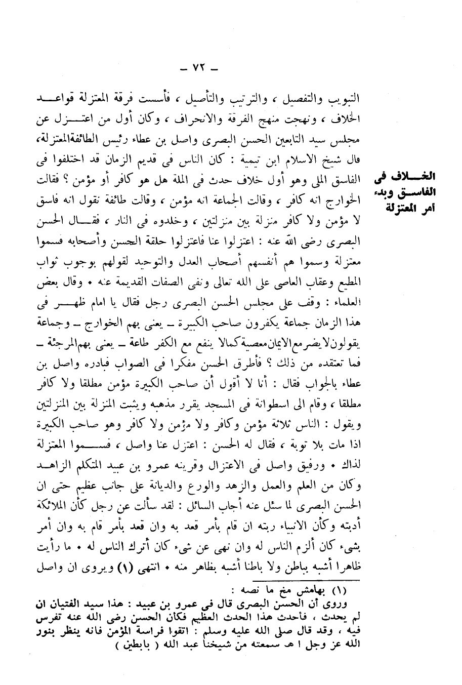 التَّبْوِيبِ وَالتَّفْصِيلِ، وَالتَّرْتِيبِ وَالتَّأْصِيلِ، فَأَسَّسَتْ فِرْقَةُ الْمُعْتَزِلَةِ قَوَاعِدَ الْخِلَافِ، وَنَهَجَتْ مَنْهَجَ الِانْحِرَافِ، وَكَانَ أَوَّلَ مَنِ اعْتَزَلَ عَنْ مَجْلِسِ سَيِّدِ التَّابِعِينَ الْحَسَنِ الْبَصْرِيِّ وَاصِلُ بْنُ عَطَاءٍ رَئِيسُ الطَّائِفَةِ الْمُعْتَزِلَةِ، قَالَ شَيْخُ الْإِسْلَامِ ابْنُ تَيْمِيَّةَ: كَانَ النَّاسُ فِي قَدِيمِ الزَّمَانِ قَدِ اخْتَلَفُوا فِي الْفَاسِقِ الْمِلِّيِّ، وَهُوَ أَوَّلُ خِلَافٍ حَدَثَ فِي الْمِلَّةِ، هَلْ هُوَ كَافِرٌ أَوْ مُؤْمِنٌ؟ فَقَالَتِ الْخَوَارِجُ: إِنَّهُ كَافِرٌ، وَقَالَتِ الْجَمَاعَةُ: إِنَّهُ مُؤْمِنٌ، وَقَالَتْ طَائِفَةٌ: نَقُولُ إِنَّهُ فَاسِقٌ لَا مُؤْمِنٌ وَلَا كَافِرٌ، مَنْزِلَةٌ بَيْنَ مَنْزِلَتَيْنِ، وَخَلَّدُوهُ فِي النَّارِ، فَقَالَ الْحَسَنُ الْبَصْرِيُّ رَضِيَ اللَّهُ عَنْهُ: اعْتَزِلُوا عَنَّا، فَاعْتَزَلُوا حَلْقَةَ الْحَسَنِ وَأَصْحَابِهِ، فَسُمُّوا مُعْتَزِلَةً، وَسَمَّوْا هُمْ أَنْفُسَهُمْ أَصْحَابَ الْعَدْلِ وَالتَّوْحِيدِ، لِقَوْلِهِمْ بِوُجُوبِ ثَوَابِ الْمُطِيعِ، وَعِقَابِ الْعَاصِي عَلَى اللَّهِ تَعَالَى، وَنَفْيِ الصِّفَاتِ الْقَدِيمَةِ عَنْهُ، وَقَالَ بَعْضُ الْعُلَمَاءِ: وَقَفَ عَلَى مَجْلِسِ الْحَسَنِ الْبَصْرِيِّ رَجُلٌ، فَقَالَ: يَا إِمَامُ، ظَهَرَ فِي هَذَا الزَّمَانِ جَمَاعَةٌ يُكَفِّرُونَ صَاحِبَ الْكَبِيرَةِ - يَعْنِي بِهِمُ الْخَوَارِجَ، وَجَمَاعَةٌ يَقُولُونَ: لَا يَضُرُّ مَعَ الْإِيمَانِ مَعْصِيَةٌ، كَمَا لَا يَنْفَعُ مَعَ الْكُفْرِ طَاعَةٌ - يَعْنِي بِهِمُ الْمُرْجِئَةَ، فَمَا تَعْتَقِدُهُ مِنْ ذَلِكَ؟ فَأَطْرَقَ الْحَسَنُ مُفَكِّرًا فِي الصَّوَابِ، فَبَادَرَهُ وَاصِلُ بْنُ عَطَاءٍ بِالْجَوَابِ، فَقَالَ: أَنَا لَا أَقُولُ إِنَّ صَاحِبَ الْكَبِيرَةِ مُؤْمِنٌ مُطْلَقًا، وَلَا كَافِرٌ مُطْلَقًا، وَقَامَ إِلَى أُسْطُوَانَةٍ فِي الْمَسْجِدِ، يُقَرِّرُ مَذْهَبَهُ وَيُثْبِتُ الْمَنْزِلَةَ بَيْنَ الْمَنْزِلَتَيْنِ، وَيَقُولُ: النَّاسُ ثَلَاثَةٌ: مُؤْمِنٌ، وَكَافِرٌ، وَلَا مُؤْمِنٌ وَلَا كَافِرٌ، وَهُوَ صَاحِبُ الْكَبِيرَةِ، إِذَا مَاتَ بِلَا تَوْبَةٍ، فَقَالَ لَهُ الْحَسَنُ: اعْتَزَلَ عَنَّا وَاصِلٌ، فَسُمُّوا الْمُعْتَزِلَةَ لِذَاكَ، وَرَفِيقُ وَاصِلٍ فِي الِاعْتِزَالِ وَقَرِينُهُ عَمْرُو بْنُ عُبَيْدٍ الْمُتَكَلِّمُ الزَّاهِدُ، وَكَانَ مِنَ الْعِلْمِ وَالْعَمَلِ وَالزُّهْدِ وَالْوَرَعِ وَالدِّيَانَةِ عَلَى جَانِبٍ عَظِيمٍ، حَتَّى إِنَّ الْحَسَنَ الْبَصْرِيَّ لَمَّا سُئِلَ عَنْهُ، أَجَابَ السَّائِلَ: لَقَدْ سَأَلْتَ عَنْ رَجُلٍ كَأَنَّ الْمَلَائِكَةَ أَدَّبَتْهُ، وَكَأَنَّ الْأَنْبِيَاءَ رَبَّتْهُ، إِنْ قَامَ بِأَمْرٍ قَعَدَ بِهِ، وَإِنْ قَعَدَ بِأَمْرٍ قَامَ بِهِ، وَإِنْ أَمَرَ بِشَيْءٍ كَانَ أَلْزَمَ النَّاسِ لَهُ، وَإِنْ نَهَى عَنْ شَيْءٍ كَانَ أَتْرَكَ النَّاسِ لَهُ، مَا رَأَيْتُ ظَاهِرًا أَشْبَهَ بِبَاطِنٍ، وَلَا بَاطِنًا أَشْبَهَ بِظَاهِرٍ مِنْهُ، انْتَهَى، وَيُرْوَى أَنَّ وَاصِلَ