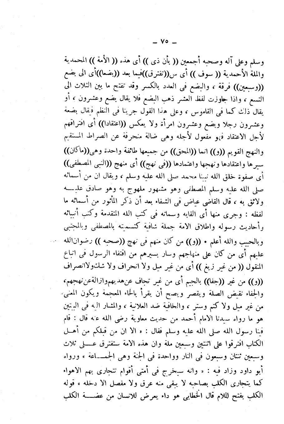 وَسَلَّمَ وَعَلَى آلِهِ وَصَحْبِهِ أَجْمَعِينَ، (بِأَنَّ ذِي) أَيْ هَذِهِ (الْأُمَّةَ) الْمُحَمَّدِيَّةَ، وَالْمِلَّةَ الْأَحْمَدِيَّةَ (سَوْفَ) أَيْ سَـ (تَفْتَرِقُ) فِيمَا بَعْدُ (بِضْعًا) أَيْ إِلَى بِضْعٍ (وَسَبْعِينَ) فِرْقَةً، وَالْبِضْعُ فِي الْعَدَدِ بِالْكَسْرِ - وَقَدْ تُفْتَحُ - مَا بَيْنَ الثَّلَاثِ إِلَى التِّسْعِ، وَإِذَا جَاوَزَتْ لَفْظَ الْعَشْرِ ذَهَبَ الْبِضْعُ، فَلَا يُقَالُ بِضْعٌ وَعِشْرُونَ، أَوْ يُقَالُ ذَلِكَ كَمَا فِي الْقَامُوسِ، وَعَلَى هَذَا الْقَوْلِ جَرَيْنَا فِي النَّظْمِ، فَيُقَالُ: بِضْعَةٌ وَعِشْرُونَ رَجُلًا، وَبِضْعٌ وَعِشْرُونَ امْرَأَةً، وَلَا يُعْكَسُ (اعْتِقَادًا) أَيِ افْتِرَاقُهُمْ لِأَجْلِ الِاعْتِقَادِ، فَهُوَ مَفْعُولٌ لِأَجْلِهِ، وَهِيَ ضَالَّةٌ مُنْحَرِفَةٌ عَنِ الصِّرَاطِ الْمُسْتَقِيمِ، وَالنَّهْجِ الْقَوِيمِ (وَ) إِنَّمَا (الْمُحِقُّ) مِنْ جَمِيعِهَا طَائِفَةٌ وَاحِدَةٌ، وَهِيَ (مَا كَانَ) سَيْرُهَا وَاعْتِقَادُهَا وَنَهْجُهَا وَاعْتِمَادُهَا (فِي نَهْجِ) أَيْ مَنْهَجِ (النَّبِيِّ الْمُصْطَفَى) أَيْ صَفْوَةِ خَلْقِ اللَّهِ نَبِيِّنَا مُحَمَّدٍ صَلَّى اللَّهُ عَلَيْهِ وَسَلَّمَ، وَيُقَالُ: إِنَّ مِنْ أَسْمَائِهِ - صَلَّى اللَّهُ عَلَيْهِ وَسَلَّمَ - الْمُصْطَفَى، وَهُوَ مَشْهُورٌ مَلْهُوجٌ بِهِ، وَهُوَ صَادِقٌ عَلَيْهِ وَلَائِقٌ بِهِ، قَالَ الْقَاضِيَ عِيَاضٌ فِي الشِّفَاءِ بَعْدَ أَنْ ذَكَرَ الْمَأْثُورَ مِنْ أَسْمَائِهِ مَا لَفْظُهُ: وَجَرَى مِنْهَا، أَيْ أَلْقَابِهِ وَسِمَاتِهِ فِي كُتُبِ اللَّهِ الْمُتَقَدِّمَةِ، وَكُتُبِ أَنْبِيَائِهِ، وَأَحَادِيثِ رَسُولِهِ، وَإِطْلَاقِ الْأُمَّةِ جُمْلَةً شَافِيَةً كَتَسْمِيَتِهِ بِالْمُصْطَفَى، وَبِالْمُجْتَبَى، وَبِالْحَبِيبِ، وَاللَّهُ أَعْلَمُ. (وَ) مَنْ كَانَ مِنْهُمْ فِي نَهْجِ (صَحْبِهِ) رِضْوَانُ اللَّهِ عَلَيْهِمْ ; أَيْ مَنْ كَانَ عَلَى مِنْهَاجِهِمْ، وَسَارَ بِسَيْرِهِمْ، مِنِ اقْتِفَاءِ الرَّسُولِ فِي اتِّبَاعِ الْمَنْقُولِ (مِنْ غَيْرِ زَيْغٍ) أَيْ مِنْ غَيْرِ مَيْلٍ وَلَا انْحِرَافٍ وَلَا شَكٍّ وَلَا انْصِرَافٍ، (وَ) مِنْ غَيْرِ (جَفَا) بِالْجِيمِ أَيْ مِنْ غَيْرِ تَجَافٍ عَنْ هَدْيِهِمْ، وَإِزَالَةٍ عَنْ نَهْجِهِمْ، وَالْجَفَاءُ نَقِيضُ الصِّلَةِ، وَيُقْصَرُ وَيَصِحُّ أَنْ يُقْرَأَ بِالْخَاءِ الْمُعْجَمَةِ، وَيَكُونُ الْمَعْنَى مِنْ غَيْرِ مَيْلٍ، وَلَا كَتْمٍ وَسَتْرٍ، وَالْخَافِيَةُ ضِدُّ الْعَلَانِيَةِ، وَالْمُشَارُ إِلَيْهِ فِي الْبَيْتَيْنِ هُوَ مَا رَوَاهُ سَيِّدُنَا الْإِمَامُ أَحْمَدُ مِنْ حَدِيثِ مُعَاوِيَةَ رَضِيَ اللَّهُ عَنْهُ قَالَ: قَامَ فِينَا رَسُولُ اللَّهِ صَلَّى اللَّهُ عَلَيْهِ وَسَلَّمَ فَقَالَ: « (أَلَا إِنَّ مَنْ قَبْلَكُمْ مِنْ أَهْلِ الْكِتَابِ افْتَرَقُوا عَلَى اثْنَتَيْنِ وَسَبْعِينَ مِلَّةً، وَإِنَّ هَذِهِ الْأُمَّةَ سَتَفْتَرِقُ عَلَى ثَلَاثٍ وَسَبْعِينَ، ثِنْتَانِ وَسَبْعُونَ فِي النَّارِ، وَوَاحِدَةٌ فِي الْجَنَّةِ، وَهِيَ الْجَمَاعَةُ» . وَرَوَاهُ أَبُو دَاوُدَ، وَزَادَ فِيهِ: ( «وَإِنَّهُ سَيَخْرُجُ فِي أُمَّتِي أَقْوَامٌ تَتَجَارَى بِهِمُ الْأَهْوَاءُ كَمَا يَتَجَارَى الْكَلَبُ بِصَاحِبِهِ، لَا يَبْقَى مِنْهُ عِرْقٌ وَلَا مَفْصِلٌ إِلَّا دَخَلَهُ» ) ، قَوْلُهُ: الْكَلَبُ بِفَتْحِ اللَّامِ، قَالَ الْخَطَّابِيُّ: هُوَ دَاءٌ يَعْرِضُ لِلْإِنْسَانِ مِنْ عَضَّةِ