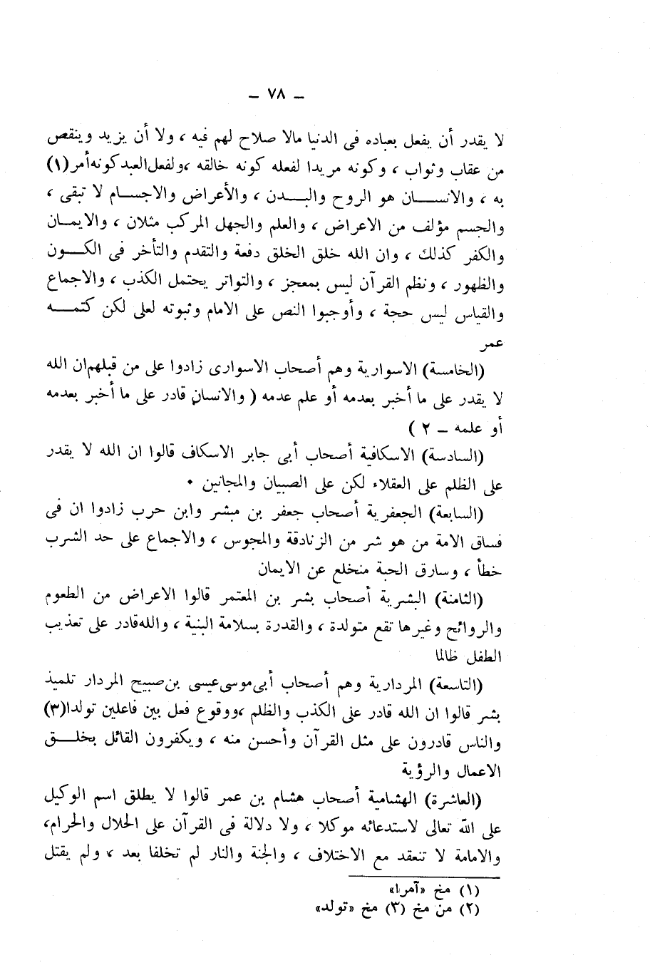 لَا يَقْدِرُ أَنْ يَفْعَلَ بِعِبَادِهِ فِي الدُّنْيَا مَا لَا صَلَاحَ لَهُمْ فِيهِ، وَلَا أَنْ يَزِيدَ وَيَنْقُصَ مِنْ عِقَابٍ وَثَوَابٍ، وَكَوْنُهُ مُرِيدًا لِفِعْلِهِ كَوْنُهُ خَالِقَهُ، وَلِفِعْلِ الْعَبْدِ كَوْنُهُ أَمَرَ بِهِ، وَالْإِنْسَانُ هُوَ الرُّوحُ وَالْبَدَنُ، وَالْأَعْرَاضُ وَالْأَجْسَامُ لَا تَبْقَى، وَالْجِسْمُ مُؤَلَّفٌ مِنَ الْأَعْرَاضِ، وَالْعِلْمُ وَالْجَهْلُ الْمُرَكَّبُ مِثْلَانِ، وَالْإِيمَانُ وَالْكُفْرُ كَذَلِكَ، وَإِنَّ اللَّهَ خَلَقَ الْخَلْقَ دَفْعَةً وَالتَّقَدُّمَ وَالتَّأَخُّرَ فِي الْكَوْنِ وَالظُّهُورَ، وَنَظْمُ الْقُرْآنِ لَيْسَ بِمُعْجِزٍ، وَالتَّوَاتُرُ يَحْتَمِلُ الْكَذِبَ، وَالْإِجْمَاعُ وَالْقِيَاسُ لَيْسَ بِحُجَّةٍ، وَأَوْجَبُوا النَّصَّ عَلَى الْإِمَامِ وَثُبُوتَهُ لِعَلِيٍّ لَكِنْ كَتَمَهُ عُمَرُ.