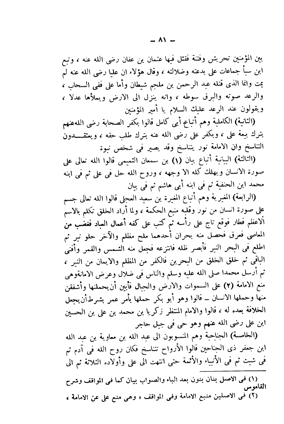 (الثَّالِثَةُ) الْبَيَانِيَّةُ أَتْبَاعُ بَيَانِ بْنِ سَمْعَانَ التَّمِيمِيِّ، قَالُوا: اللَّهُ - تَعَالَى - عَلَى صُورَةِ الْإِنْسَانِ، وَيَهْلِكُ كُلُّهُ إِلَّا وَجْهَهُ، وَرُوحُ اللَّهِ حَلَّ فِي عَلِيٍّ، ثُمَّ فِي ابْنِهِ مُحَمَّدِ ابْنِ الْحَنَفِيَّةِ، ثُمَّ فِي ابْنِهِ أَبِي هَاشِمٍ، ثُمَّ فِي بَيَانٍ.