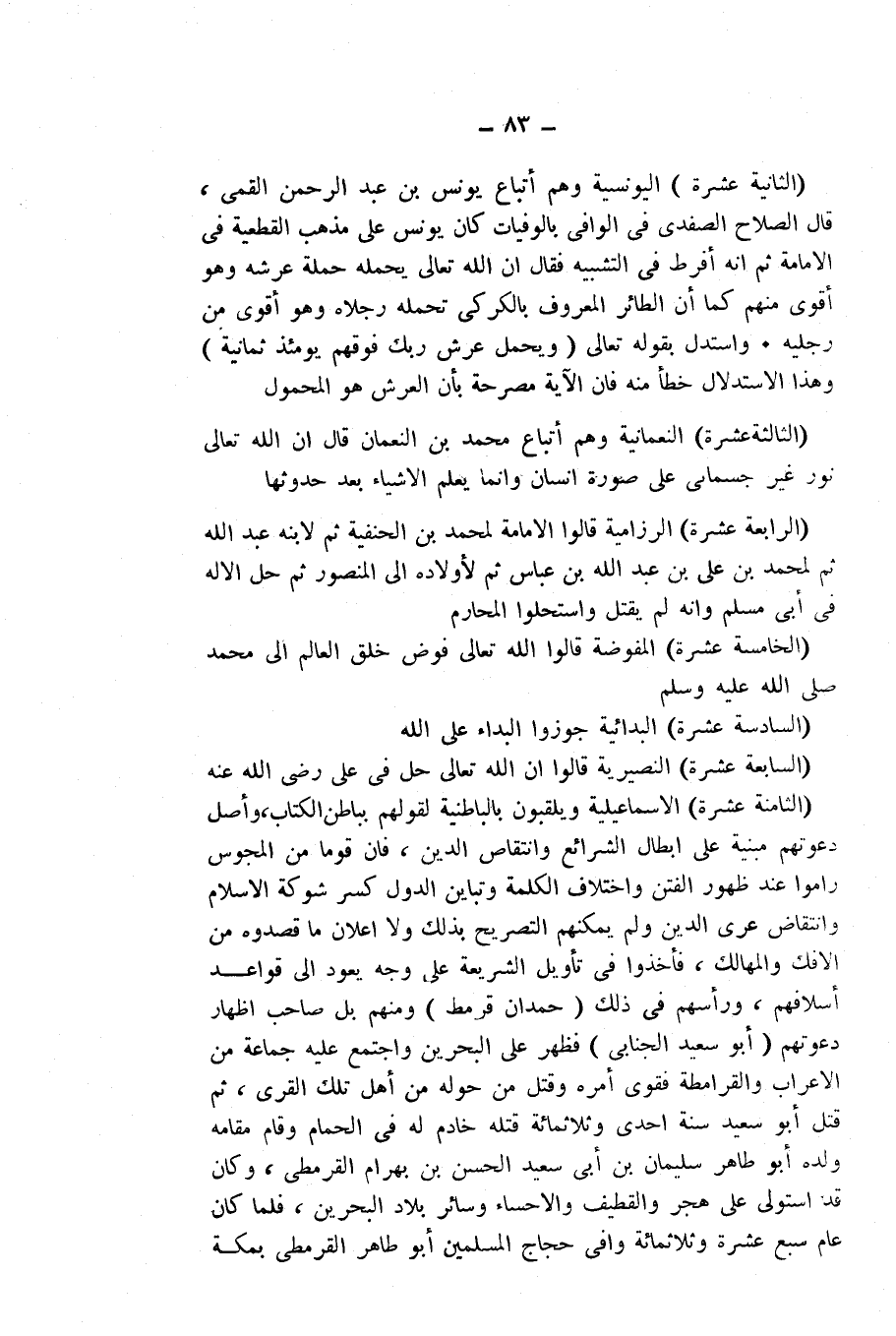 (الثَّامِنَةَ عَشْرَةَ) : الْإِسْمَاعِيلِيَّةُ وَيُلَقَّبُونَ بِالْبَاطِنِيَّةِ ; لِقَوْلِهِمْ بِبَاطِنِ الْكِتَابِ، وَأَصْلُ دَعْوَتِهِمْ مَبْنِيَّةٌ عَلَى إِبْطَالِ الشَّرَائِعِ وَانْتِقَاصِ الدِّينِ، فَإِنَّ قَوْمًا مِنَ الْمَجُوسِ رَامُوا عِنْدَ ظُهُورِ الْفِتَنِ، وَاخْتِلَافِ الْكَلِمَةِ، وَتَبَايُنِ الدُّوَلِ، كَسْرَ شَوْكَةِ الْإِسْلَامِ، وَانْتِقَاضَ عُرَى الدِّينِ، وَلَمْ يُمْكِنْهُمُ التَّصْرِيحُ بِذَلِكَ، وَلَا إِعْلَانُ مَا قَصَدُوهُ مِنَ الْإِفْكِ وَالْمَهَالِكِ، فَأَخَذُوا فِي تَأْوِيلِ الشَّرِيعَةِ عَلَى وَجْهٍ يَعُودُ إِلَى قَوَاعِدِ أَسْلَافِهِمْ، وَرَأْسُهُمْ فِي ذَلِكَ (حَمْدَانُ قِرْمِطٌ) ، وَمِنْهُمْ بَلْ صَاحِبُ إِظْهَارِ دَعْوَتِهِمْ (أَبُو سَعِيدٍ الْجَنَّابِيُّ) ، فَظَهَرَ عَلَى الْبَحْرَيْنِ، وَاجْتَمَعَ عَلَيْهِ جَمَاعَةٌ مِنَ الْأَعْرَابِ وَالْقَرَامِطَةِ، فَقَوِيَ أَمْرُهُ، وَقَتَلَ مَنْ حَوْلَهُ مِنْ أَهْلِ تِلْكَ الْقُرَى، ثُمَّ قُتِلَ أَبُو سَعِيدٍ سَنَةَ إِحْدَى وَثَلَاثِمِائَةٍ، قَتَلَهُ خَادِمٌ لَهُ فِي الْحَمَّامِ، وَقَامَ مَقَامَهُ وَلَدُهُ أَبُو طَاهِرٍ سُلَيْمَانُ بْنُ أَبِي سَعِيدٍ الْحَسَنِ بْنِ بَهْرَامَ الْقِرْمِطِيُّ، وَكَانَ قَدِ اسْتَوْلَى عَلَى هَجَرِ الْقَطِيفِ وَالْإِحْسَاءِ وَسَائِرِ بِلَادِ الْبَحْرَيْنِ، فَلَمَّا كَانَ عَامُ سَبْعَ عَشْرَةَ وَثَلَاثِمِائَةٍ وَافَى حُجَّاجَ الْمُسْلِمِينَ أَبُو طَاهِرٍ الْقِرْمِطِيُّ بِمَكَّةَ