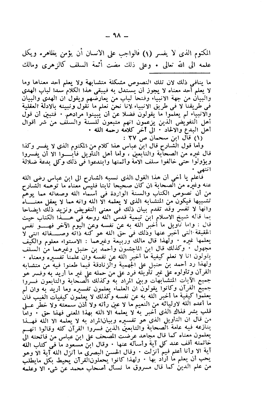 الْمَكْتُومِ الَّذِي لَا يُفَسَّرُ، فَالْوَاجِبُ عَلَى الْإِنْسَانِ أَنْ يُؤْمِنَ بِظَاهِرِهِ، وَيَكِلَ عِلْمَهُ إِلَى اللَّهِ - تَعَالَى. وَعَلَى ذَلِكَ مَضَتْ أَئِمَّةُ السَّلَفِ، كَالزُّهْرِيِّ وَمَالِكٍ،