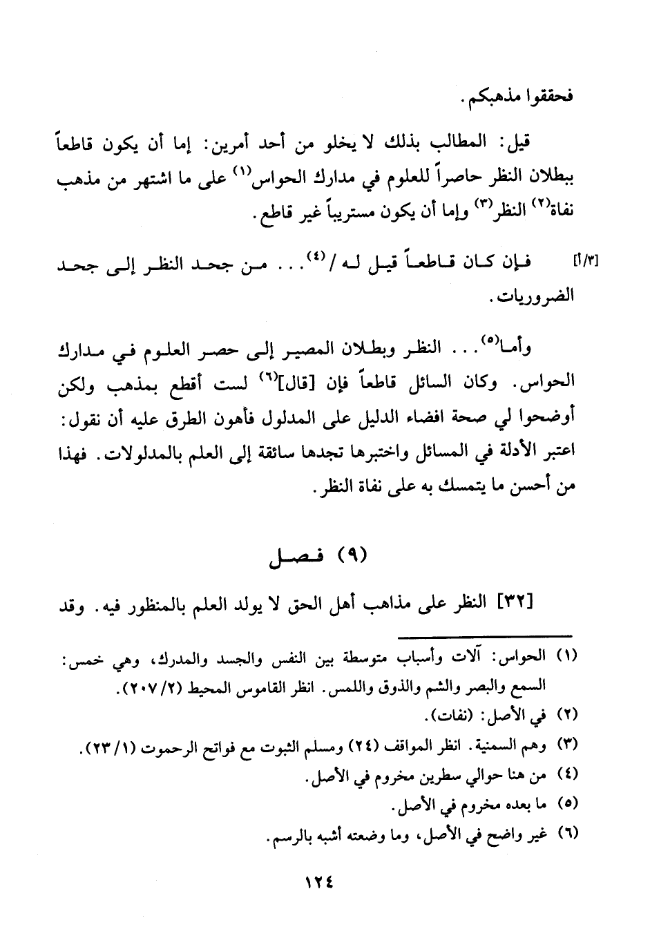 [32] النّظر على مَذَاهِب أهل الْحق لَا يُولد الْعلم بالمنظور فِيهِ. وَقد