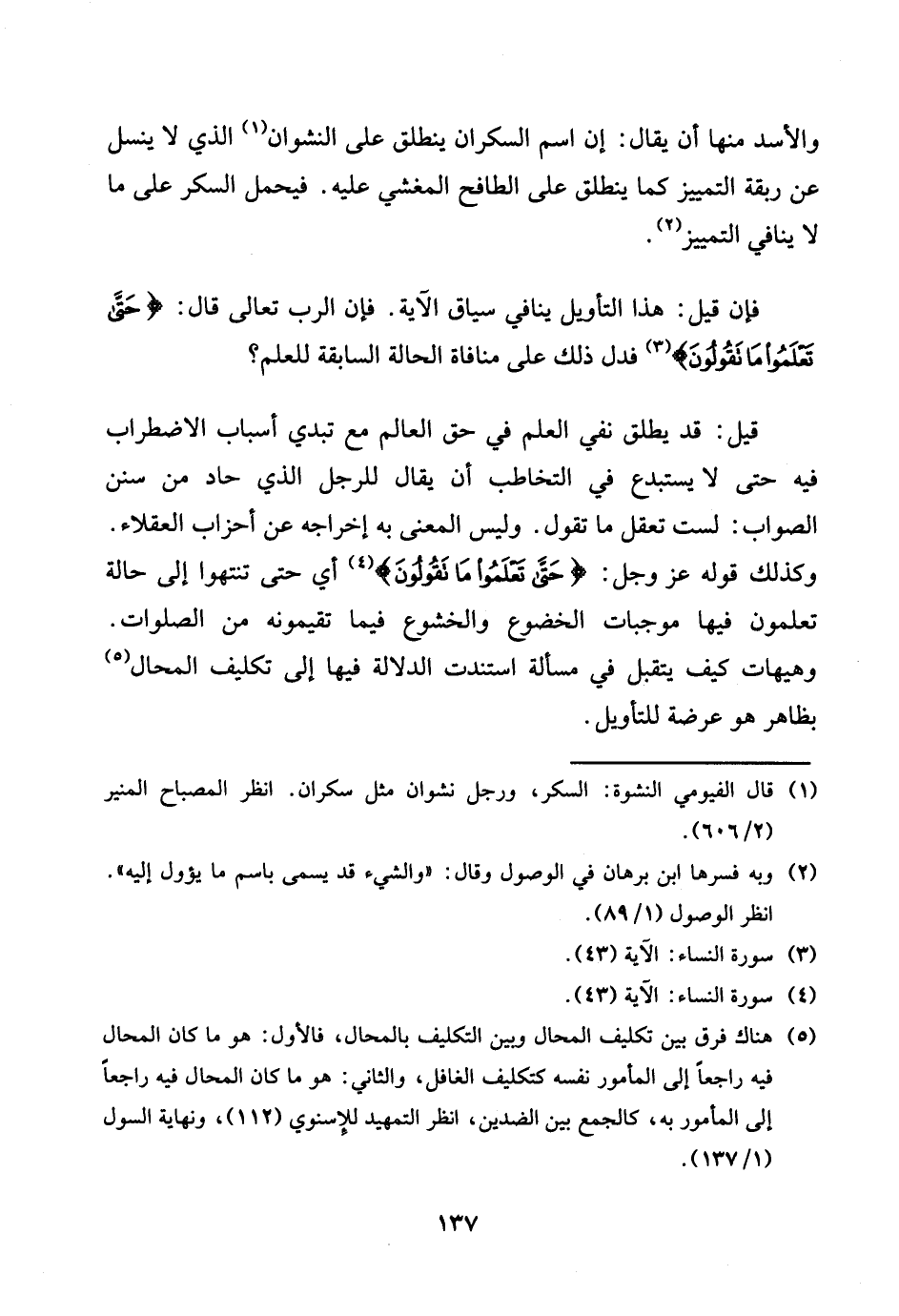 قيل: قد يُطلق نفي الْعلم فِي حق الْعَالم مَعَ تبدي أَسبَاب الِاضْطِرَاب فِيهِ حَتَّى لَا يستبدع فِي التخاطب أَن يُقَال للرجل الَّذِي حاد من سنَن الصَّوَاب: لست تعقل مَا تَقول. وَلَيْسَ الْمَعْنى بِهِ إِخْرَاجه عَن أحزاب الْعُقَلَاء. وَكَذَلِكَ قَوْله عز وَجل: {حَتَّى تعلمُوا مَا تَقولُونَ} أَي حَتَّى تنتهوا إِلَى حَالَة تعلمُونَ فِيهَا مُوجبَات الخضوع والخشوع فِيمَا تقيمونه من الصَّلَوَات. وهيهات كَيفَ يتَقَبَّل فِي مَسْأَلَة استندت الدّلَالَة فِيهَا إِلَى تَكْلِيف الْمحَال بِظَاهِر هُوَ عرضة للتأويل.