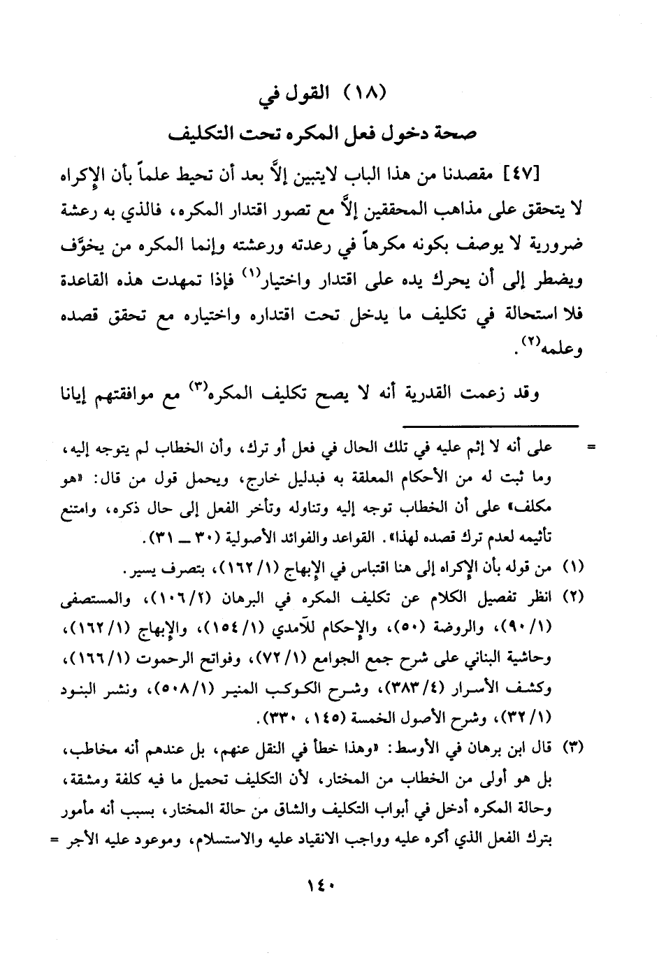 [47] مقصدنا من هَذَا الْبَاب لَا يتَبَيَّن إِلَّا بعد أَن تحيط علما بِأَن الْإِكْرَاه لَا يتَحَقَّق على مَذَاهِب الْمُحَقِّقين إِلَّا مَعَ تصور اقتدار الْمُكْره، فَالَّذِي بِهِ رعشة ضَرُورِيَّة لَا يُوصف بِكَوْنِهِ مكْرها فِي رعدته ورعشته وَإِنَّمَا الْمُكْره من يخوف ويضطر إِلَى أَن يُحَرك يَده على اقتدار وَاخْتِيَار فَإِذا تمهدت هَذِه الْقَاعِدَة فَلَا اسْتِحَالَة فِي تَكْلِيف مَا يدْخل تَحت اقتداره واختياره مَعَ تحقق قَصده وَعلمه.