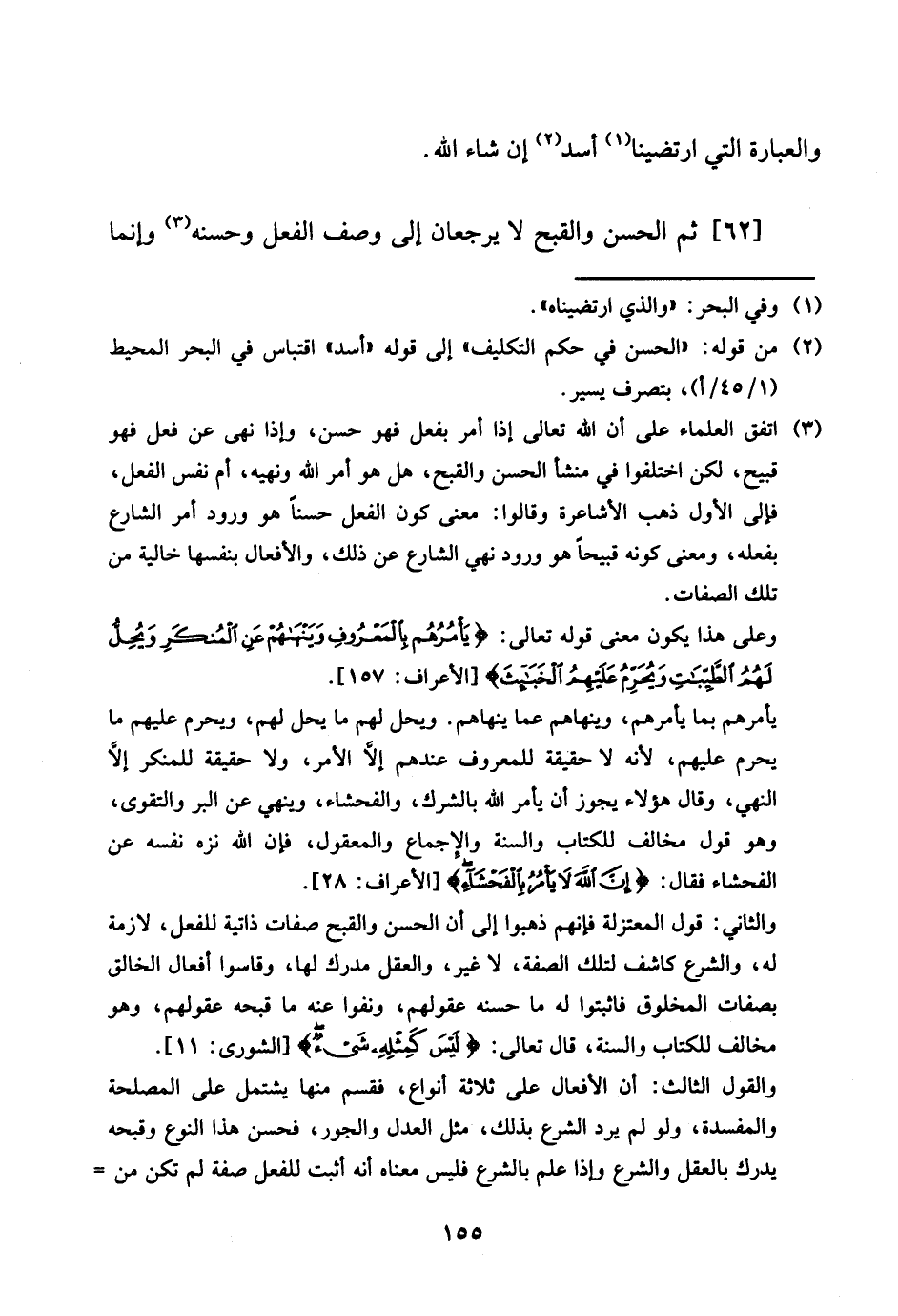 [62] ثمَّ الْحسن والقبح لَا يرجعان إِلَى وصف الْفِعْل وَحسنه وَإِنَّمَا