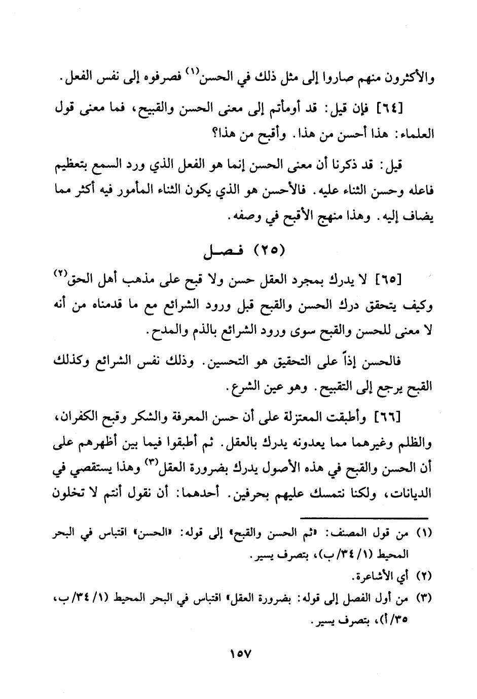 [65] لَا يدْرك بِمُجَرَّد الْعقل حسن وَلَا قبح على مَذْهَب أهل الْحق وَكَيف يتَحَقَّق دَرك الْحسن والقبح قبل وُرُود الشَّرَائِع مَعَ مَا قدمْنَاهُ من أَنه لَا معنى لِلْحسنِ والقبح سوى وُرُود الشَّرَائِع بالذم والمدح.