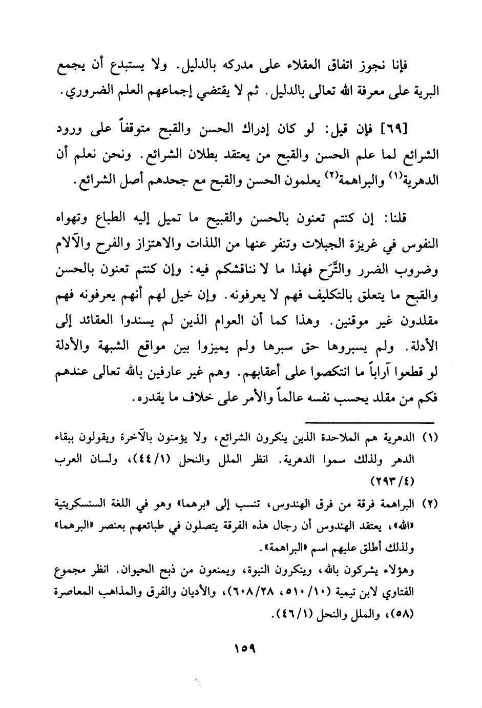 [69] فَإِن قيل: لَو كَانَ إِدْرَاك الْحسن والقبح متوقفا على وُرُود الشَّرَائِع لما علم الْحسن والقبح من يعْتَقد بطلَان الشَّرَائِع. وَنحن نعلم أَن الدهرية والبراهمة يعلمُونَ الْحسن والقبح مَعَ جحدهم أصل الشَّرَائِع.
