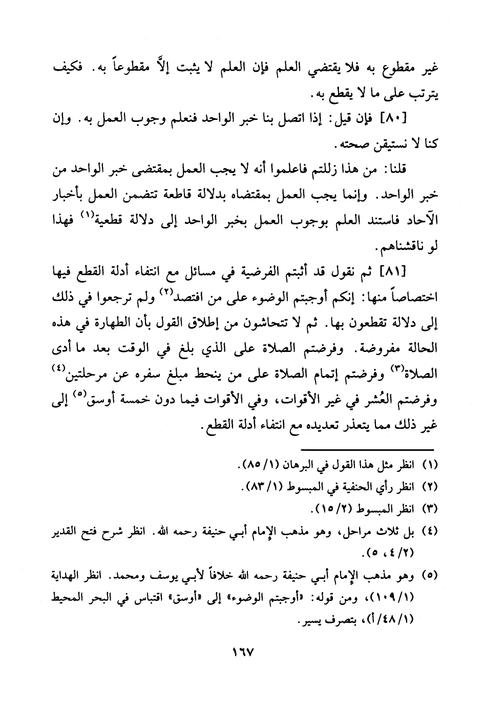 [81] ثمَّ نقُول قد أثبتم الْفَرْضِيَّة فِي مسَائِل مَعَ انْتِفَاء أَدِلَّة الْقطع فِيهَا اختصاصا مِنْهَا: إِنَّكُم أوجبتم الْوضُوء على من افتصد وَلم ترجعوا فِي ذَلِك إِلَى دلَالَة تقطعون بهَا. ثمَّ لَا تتحاشون من إِطْلَاق القَوْل بِأَن الطَّهَارَة فِي هَذِه الْحَالة مَفْرُوضَة. وفرضتم الصَّلَاة على الَّذِي بلغ فِي الْوَقْت بعد مَا أدّى الصَّلَاة وفرضتم إتْمَام الصَّلَاة على من ينحط مبلغ سَفَره عَن مرحلَتَيْنِ وفرضتم الْعشْر فِي غير الأقوات، وَفِي الأقوات فِيمَا دون خَمْسَة أوسق إِلَى غير ذَلِك مِمَّا يتَعَذَّر تعديده مَعَ انْتِفَاء أَدِلَّة الْقطع.