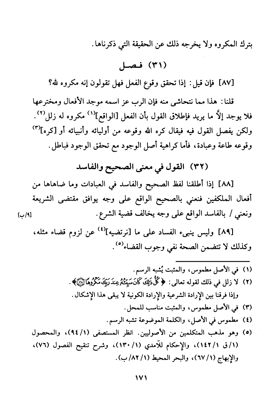 [87] فَإِن قيل: إِذا تحقق وُقُوع الْفِعْل فَهَل تَقولُونَ إِنَّه مَكْرُوه لله؟