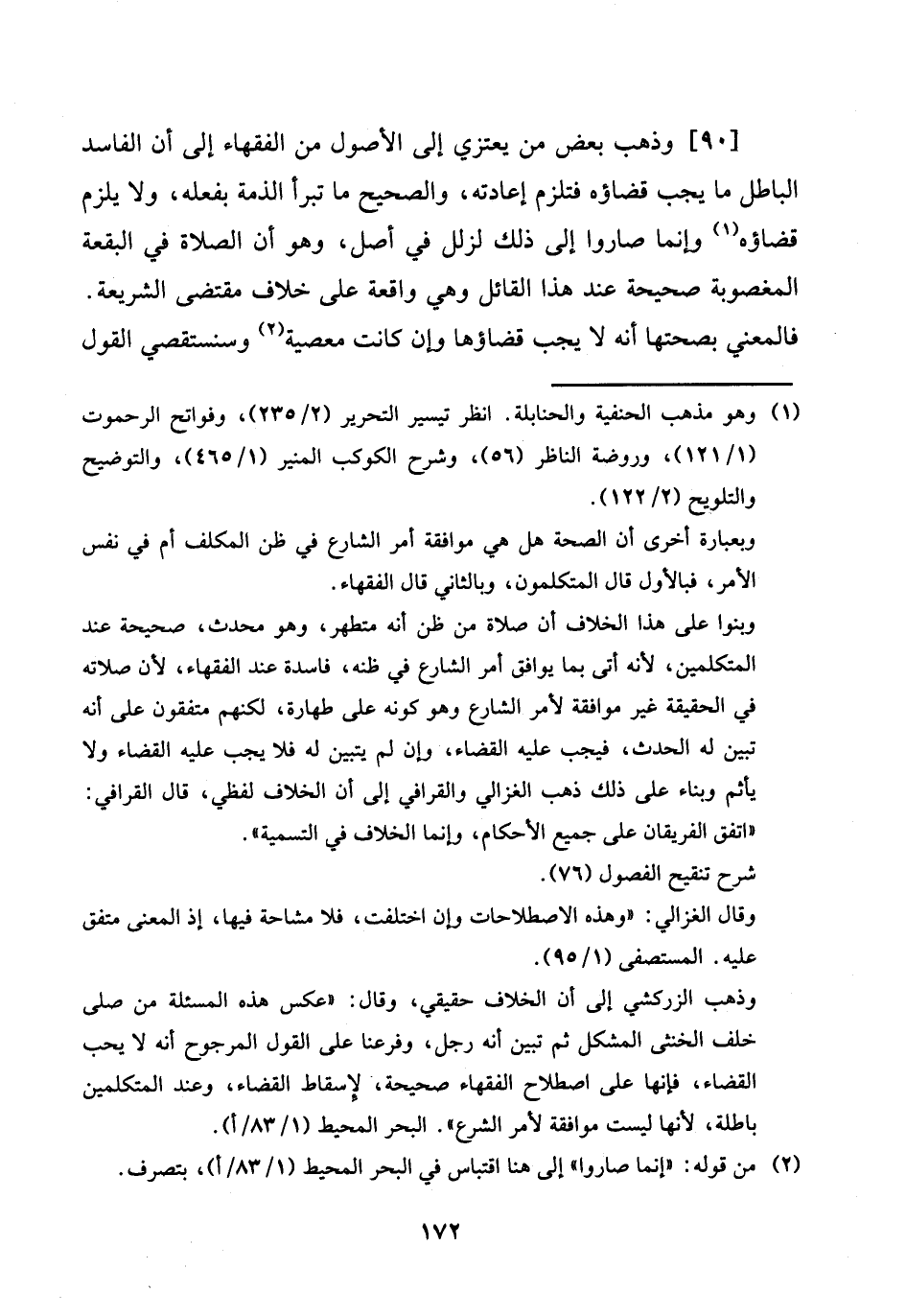 [90] وَذهب بعض من يعتزي إِلَى الْأُصُول من الْفُقَهَاء إِلَى أَن الْفَاسِد الْبَاطِل مَا يجب قَضَاؤُهُ فتلزم إِعَادَته، وَالصَّحِيح مَا تَبرأ الذِّمَّة بِفِعْلِهِ، وَلَا يلْزم قَضَاؤُهُ وَإِنَّمَا صَارُوا إِلَى ذَلِك لزلل فِي أصل، وَهُوَ أَن الصَّلَاة فِي الْبقْعَة الْمَغْصُوبَة صَحِيحَة عِنْد هَذَا الْقَائِل وَهِي وَاقعَة على خلاف مقتضي الشَّرِيعَة. فَالْمَعْنى بِصِحَّتِهَا أَنه لَا يجب قَضَاؤُهَا وَإِن كَانَت مَعْصِيّة وسنستقصي القَوْل