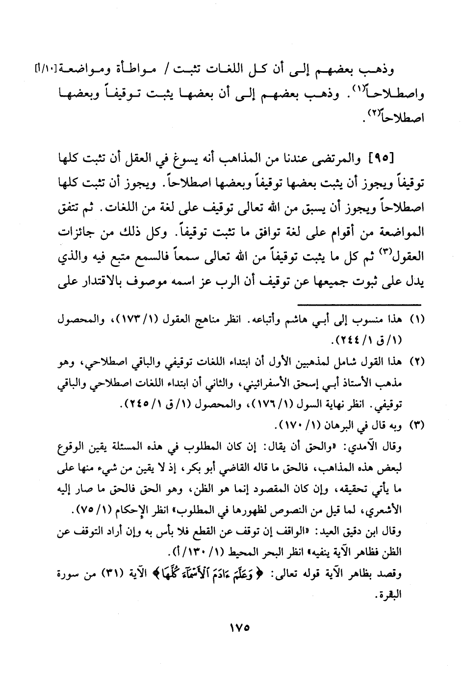[95] والمرتضى عندنَا من الْمذَاهب أَنه يسوغ فِي الْعقل أَن تثبت كلهَا توقيفا وَيجوز أَن يثبت بَعْضهَا توقيفا وَبَعضهَا اصْطِلَاحا. وَيجوز أَن تثبت كلهَا اصْطِلَاحا وَيجوز أَن يسْبق من الله تَعَالَى تَوْقِيف على لُغَة من اللُّغَات. ثمَّ تتفق الْمُوَاضَعَة من أَقوام على لُغَة توَافق مَا تثبت توقيفا. وكل ذَلِك من جائزات الْعُقُول ثمَّ كل مَا يثبت توقيفا من الله تَعَالَى سمعا فالسمع مُتبع فِيهِ وَالَّذِي يدل على ثُبُوت جَمِيعهَا عَن تَوْقِيف أَن الرب عز اسْمه مَوْصُوف بالاقتدار على