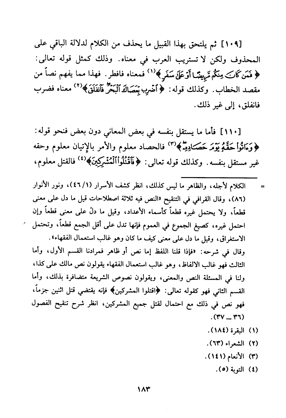 [109] ثمَّ يلْتَحق بِهَذَا الْقَبِيل مَا يحذف من الْكَلَام لدلَالَة الْبَاقِي على الْمَحْذُوف وَلَكِن لَا تستريب الْعَرَب فِي مَعْنَاهُ. وَذَلِكَ كَمثل قَوْله تَعَالَى: {فَمن كَانَ مِنْكُم مَرِيضا أَو على سفر} فَمَعْنَاه فافطر. فَهَذَا مِمَّا يفهم نصا من مقصد الْخطاب. وَكَذَلِكَ قَوْله: {اضْرِب بعصاك الْبَحْر فانفلق} مَعْنَاهُ فَضرب فانفلق، إِلَى غير ذَلِك.