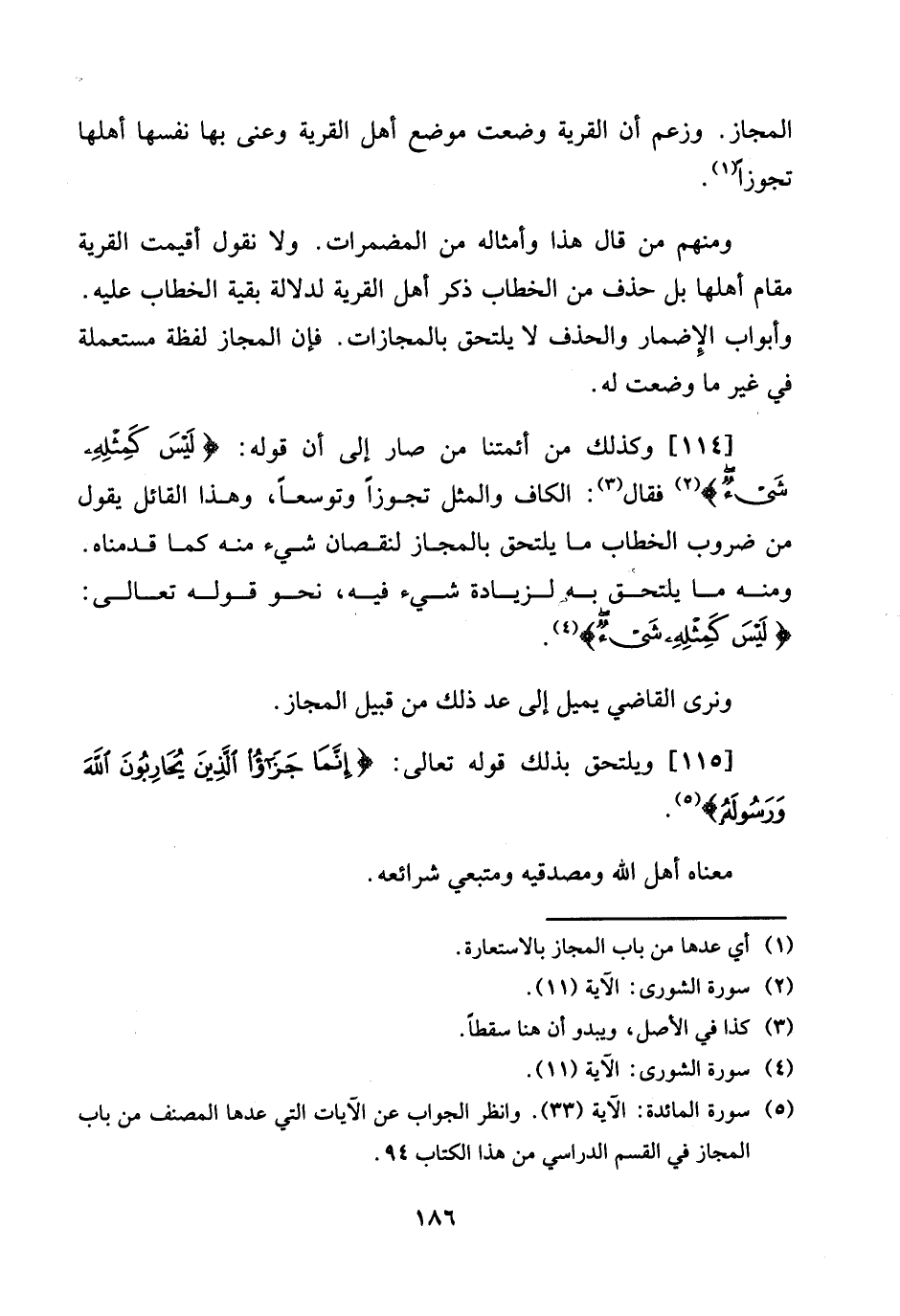 [114] وَكَذَلِكَ من أَئِمَّتنَا من صَار إِلَى أَن قَوْله: {لَيْسَ كمثله شَيْء} فَقَالَ: الْكَاف والمثل تجوزا وتوسعا، وَهَذَا الْقَائِل يَقُول من ضروب الْخطاب مَا يلْتَحق بالمجاز لنُقْصَان شَيْء مِنْهُ كَمَا قدمْنَاهُ. وَمِنْه مَا يلْتَحق بِهِ لزِيَادَة شَيْء فِيهِ، نَحْو قَوْله تَعَالَى: {لَيْسَ كمثله شَيْء} .