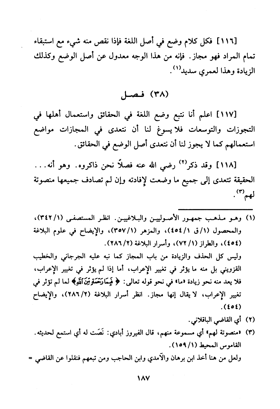 [118] وَقد ذكر رَضِي الله عَنهُ فصلا نَحن ذاكروه. وَهُوَ أَنه ... الْحَقِيقَة تتعدى إِلَى جَمِيع مَا وضعت لإفادته وَإِن لم تصادف جَمِيعهَا منصوتة لَهُم.