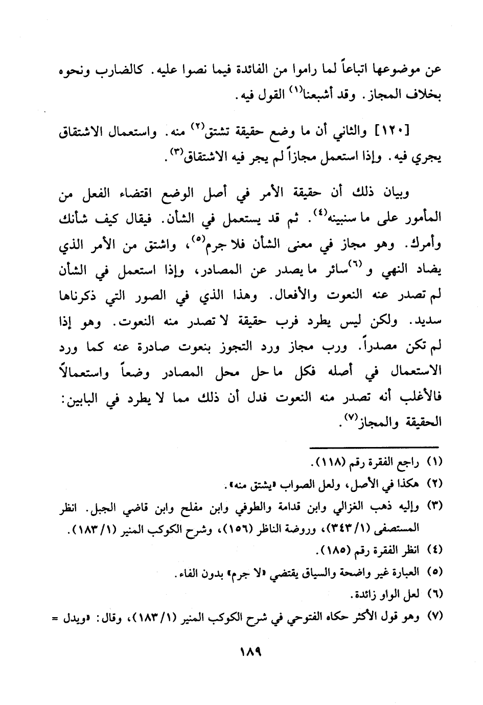 [120] وَالثَّانِي أَن مَا وضع حَقِيقَة تشتق مِنْهُ. وَاسْتِعْمَال الِاشْتِقَاق يجْرِي فِيهِ. وَإِذا اسْتعْمل مجَازًا لم يجر فِيهِ الِاشْتِقَاق.