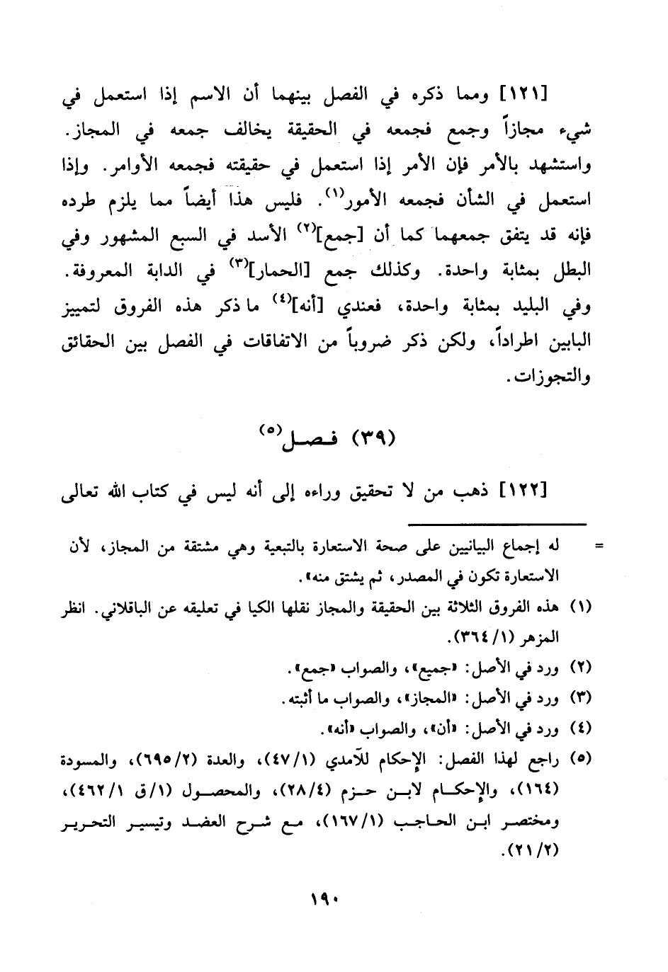 [121] وَمِمَّا ذكره فِي الْفَصْل بَينهمَا أَن الِاسْم إِذا اسْتعْمل فِي شَيْء مجَازًا وَجمع فَجَمعه فِي الْحَقِيقَة يُخَالف جمعه فِي الْمجَاز. وَاسْتشْهدَ بِالْأَمر فَإِن الْأَمر إِذا اسْتعْمل فِي حَقِيقَته فَجَمعه الْأَوَامِر. وَإِذا اسْتعْمل فِي الشَّأْن فَجَمعه الْأُمُور. فَلَيْسَ هَذَا أَيْضا مِمَّا يلْزم طرده فَإِنَّهُ قد يتَّفق جَمعهمَا كَمَا أَن [جمع] الْأسد فِي السَّبع الْمَشْهُور وَفِي البطل بِمَثَابَة وَاحِدَة. وَكَذَلِكَ جمع [الْحمار] فِي الدَّابَّة الْمَعْرُوفَة. وَفِي البليد بِمَثَابَة وَاحِدَة، فعندي [أَنه] مَا ذكر هَذِه الفروق لتمييز الْبَابَيْنِ اطرادا، وَلَكِن ذكر ضروبا من الاتفاقات فِي الْفَصْل بَين الْحَقَائِق والتجوزات.