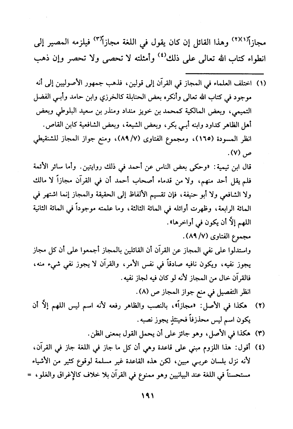 مجَازًا وَهَذَا الْقَائِل إِن كَانَ يَقُول فِي اللُّغَة مجَازًا فَيلْزمهُ الْمصير إِلَى انطواء كتاب الله تَعَالَى على ذَلِك وأمثلته لَا تحصى وَلَا تحصر وَإِن ذهب