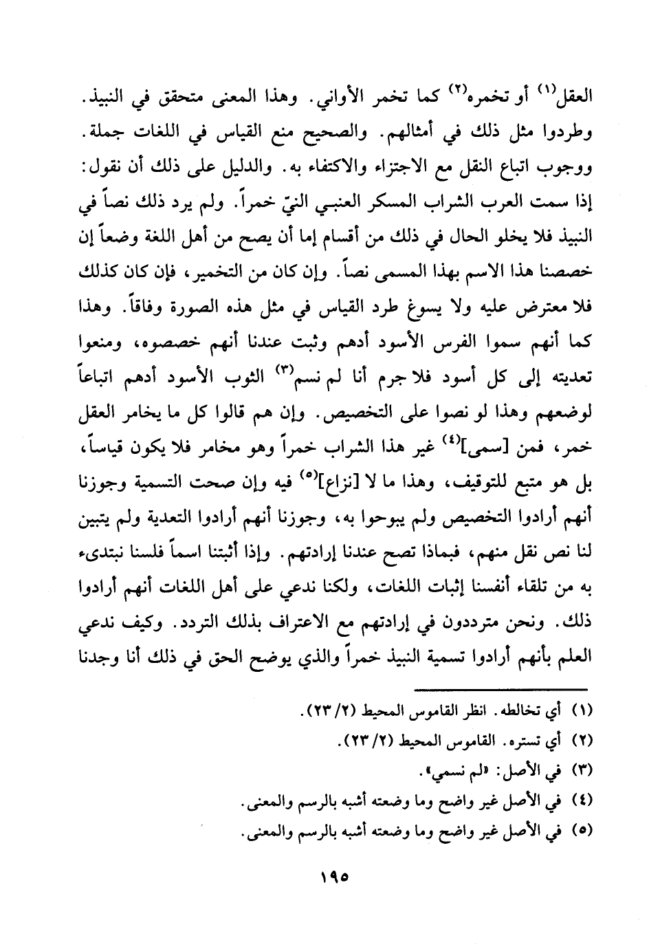 الْعقل أَو تخمره كَمَا تخمر الْأَوَانِي. وَهَذَا الْمَعْنى مُتَحَقق فِي النَّبِيذ وطردوا مثل ذَلِك فِي أمثالهم. وَالصَّحِيح منع الْقيَاس فِي اللُّغَات جملَة. وَوُجُوب اتِّبَاع النَّقْل مَعَ الاجتزاء والاكتفاء بِهِ. وَالدَّلِيل على ذَلِك أَن نقُول: إِذا سمت الْعَرَب الشَّرَاب الْمُسكر العنبي الني خمرًا. وَلم يرد ذَلِك نصا فِي النَّبِيذ فَلَا يَخْلُو الْحَال فِي ذَلِك من أَقسَام إِمَّا أَن يَصح من أهل اللُّغَة وضعا إِن خصصنا هَذَا الِاسْم بِهَذَا الْمُسَمّى نصا. وَإِن كَانَ من التخمير، فَإِن كَانَ كَذَلِك فَلَا معترض عَلَيْهِ وَلَا يسوغ طرد الْقيَاس فِي مثل هَذِه الصُّورَة وفَاقا. وَهَذَا كَمَا أَنهم سموا الْفرس الْأسود أدهم وَثَبت عندنَا أَنهم خصصوه، وَمنعُوا تعديته إِلَى كل أسود فَلَا جرم أَنا لم نسم الثَّوْب الْأسود أدهم اتبَاعا لوضعهم وَهَذَا لَو نصوا على التَّخْصِيص. وَإِن هم قَالُوا كل مَا يخَامر الْعقل خمر، فَمن [سمى] غير هَذَا الشَّرَاب خمرًا وَهُوَ مخامر فَلَا يكون قِيَاسا، بل هُوَ مُتبع للتوقيف، وَهَذَا مَا لَا [نزاع] فِيهِ وَإِن صحت التَّسْمِيَة وجوزنا أَنهم أَرَادوا التَّخْصِيص وَلم يبوحوا بِهِ، وجوزنا أَنهم أَرَادوا التَّعْدِيَة وَلم يتَبَيَّن لنا نَص نقل مِنْهُم، فبماذا تصح عندنَا إرادتهم. وَإِذا أثبتنا اسْما فلسنا نبتدئ بِهِ من تِلْقَاء أَنْفُسنَا إِثْبَات اللُّغَات، وَلَكنَّا ندعي على أهل اللُّغَات أَنهم أَرَادوا ذَلِك. وَنحن مترددون فِي إرادتهم مَعَ الِاعْتِرَاف بذلك التَّرَدُّد. وَكَيف ندعي الْعلم بِأَنَّهُم أَرَادوا تَسْمِيَة النَّبِيذ خمرًا وَالَّذِي يُوضح الْحق فِي ذَلِك أَنا وجدنَا