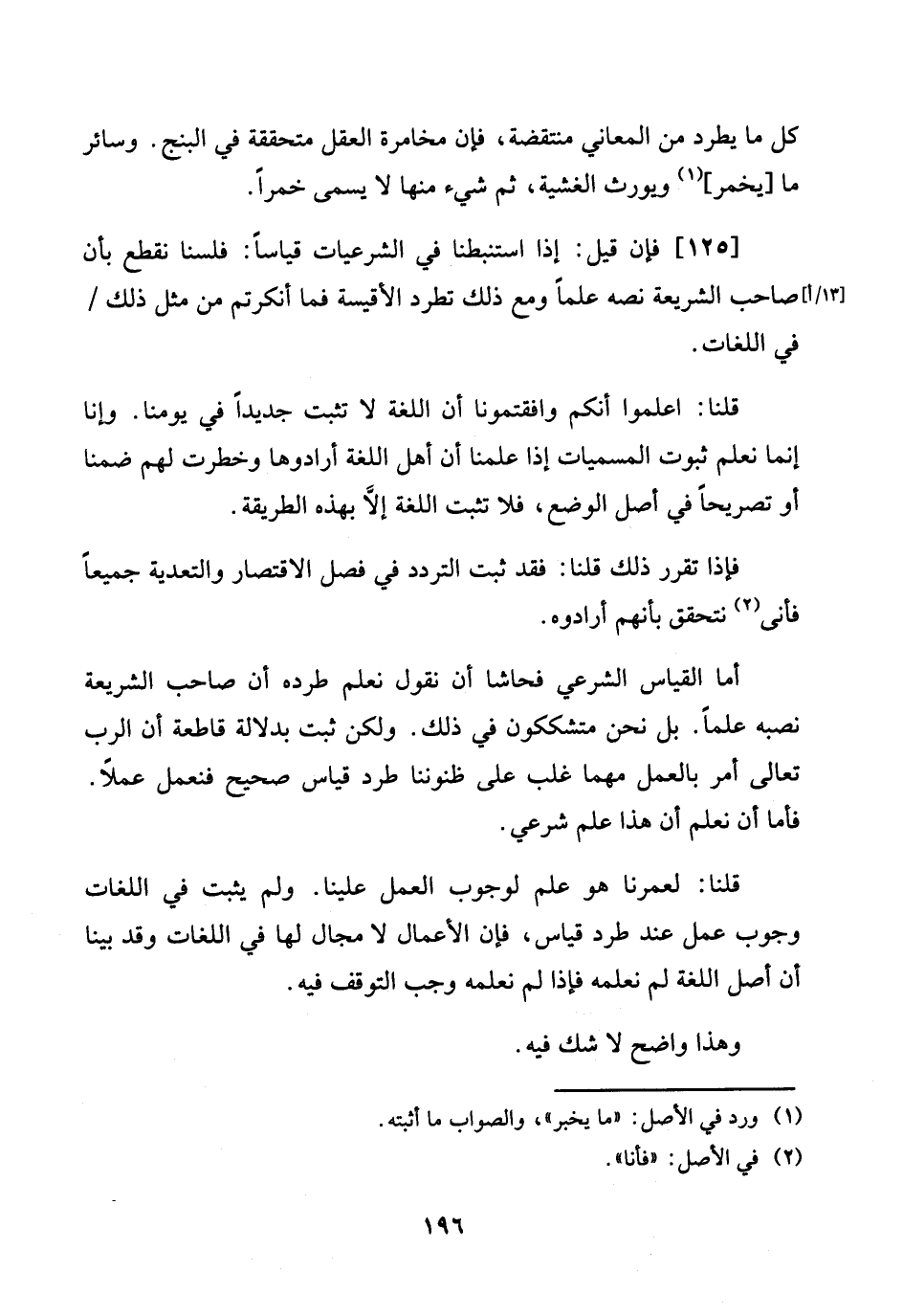 [125] فَإِن قيل: إِذا استنبطنا فِي الشرعيات قِيَاسا: فلسنا نقطع بِأَن [13 / أ] صَاحب الشَّرِيعَة نَصه علما وَمَعَ ذَلِك تطرد الأقيسة فَمَا أنكرتم من مثل ذَلِك / فِي اللُّغَات.
