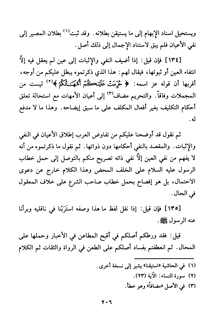 [134] فَإِن قيل: إِذا أضيف النَّفْي وَالْإِثْبَات إِلَى عين لم يعقل فِيهِ إِلَّا انْتِفَاء الْعين أَو ثُبُوتهَا، فَيُقَال لَهُم: هَذَا الَّذِي ذكرتموه يبطل عَلَيْكُم من أوجه، أقربها أَن قَوْله عز اسْمه: {حرمت عَلَيْكُم أُمَّهَاتكُم} لَيست من المجملات وفَاقا. وَالتَّحْرِيم مُضَاف إِلَى أَعْيَان الْأُمَّهَات مَعَ اسْتِحَالَة تعلق أَحْكَام التَّكْلِيف بِغَيْر أَفعَال الْمُكَلف على مَا سبق إيضاحه. وَهَذَا مَا لَا مدفع لَهُ.