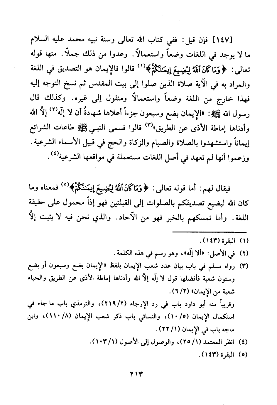 [147] فَإِن قيل: فَفِي كتاب الله تَعَالَى وَسنة نبيه مُحَمَّد عَلَيْهِ السَّلَام مَا لَا يُوجد فِي اللُّغَات وضعا واستعمالا. وعدوا من ذَلِك جملا. مِنْهَا قَوْله تَعَالَى: {وَمَا كَانَ الله لِيُضيع إيمَانكُمْ} قَالُوا فالإيمان هُوَ التَّصْدِيق فِي اللُّغَة وَالْمرَاد بِهِ فِي الْآيَة صَلَاة الَّذين صلوا إِلَى بَيت الْمُقَدّس ثمَّ نسخ التَّوَجُّه إِلَيْهِ فَهَذَا خَارج من اللُّغَة وضعا واستعمالا ومنقول إِلَى غَيره. وَكَذَلِكَ قَالَ رَسُول الله [صلى الله عَلَيْهِ وَسلم] : ((الْإِيمَان بضع وَسَبْعُونَ جُزْءا أَعْلَاهَا شَهَادَة أَن لَا إِلَه إِلَّا الله وَأَدْنَاهَا إمَاطَة الْأَذَى عَن الطَّرِيق)) قَالُوا فَسمى النَّبِي [صلى الله عَلَيْهِ وَسلم] طاعات الشَّرَائِع إِيمَانًا واستشهدوا بِالصَّلَاةِ وَالصِّيَام وَالزَّكَاة وَالْحج فِي قبيل الْأَسْمَاء الشَّرْعِيَّة. وَزَعَمُوا أَنَّهَا لم تعهد فِي أصل اللُّغَات مستعملة فِي مواقعها الشَّرْعِيَّة.