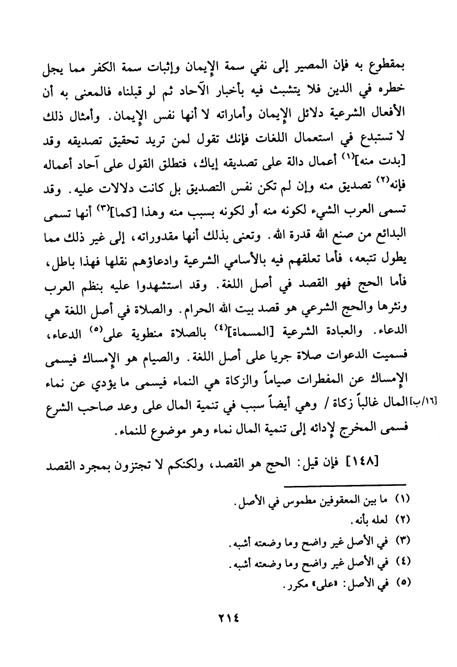 بمقطوع بِهِ فَإِن الْمصير إِلَى نفي سمة الْإِيمَان وَإِثْبَات سمة الْكفْر مِمَّا يجل خطره فِي الدّين فَلَا يتشبث فِيهِ بأخبار الْآحَاد ثمَّ لَو قبلناه فَالْمَعْنى بِهِ أَن الْأَفْعَال الشَّرْعِيَّة دَلَائِل الْإِيمَان وأماراته لَا أَنَّهَا نفس الْإِيمَان. وأمثال ذَلِك لَا تستبدع فِي اسْتِعْمَال اللُّغَات فَإنَّك تَقول لمن تُرِيدُ تَحْقِيق تَصْدِيقه وَقد [بَدَت مِنْهُ] أَعمال دَالَّة على تَصْدِيقه إياك، فَتطلق القَوْل على آحَاد أَعماله فَإِنَّهُ تَصْدِيق مِنْهُ وَإِن لم تكن نفس التَّصْدِيق بل كَانَت دلالات عَلَيْهِ. وَقد تسمى الْعَرَب الشَّيْء لكَونه مِنْهُ أَو لكَونه بِسَبَب مِنْهُ وَهَذَا [كَمَا] أَنَّهَا تسمى الْبَدَائِع من صنع الله قدرَة الله. وتعنى بذلك أَنَّهَا مقدوراته، إِلَى غير ذَلِك مِمَّا يطول تتبعه، فَأَما تعلقهم فِيهِ بالأسامي الشَّرْعِيَّة وادعاؤهم نقلهَا فَهَذَا بَاطِل، فَأَما الْحَج فَهُوَ الْقَصْد فِي أصل اللُّغَة. وَقد اسْتشْهدُوا عَلَيْهِ بنظم الْعَرَب ونثرها وَالْحج الشَّرْعِيّ هُوَ قصد بَيت الله الْحَرَام. وَالصَّلَاة فِي أصل اللُّغَة هِيَ الدُّعَاء. وَالْعِبَادَة الشَّرْعِيَّة [الْمُسَمَّاة] بِالصَّلَاةِ منطوية على الدُّعَاء، فسميت الدَّعْوَات صَلَاة جَريا على أصل اللُّغَة. وَالصِّيَام هُوَ الْإِمْسَاك فيسمى الْإِمْسَاك عَن المفطرات صياما وَالزَّكَاة هِيَ النَّمَاء فيسمى مَا يُؤَدِّي عَن نَمَاء [16 / ب] المَال غَالِبا زَكَاة / وَهِي أَيْضا سَبَب فِي تنمية المَال على وعد صَاحب الشَّرْع فَسمى الْمخْرج لإدائه إِلَى تنمية المَال نَمَاء وَهُوَ مَوْضُوع للنماء.