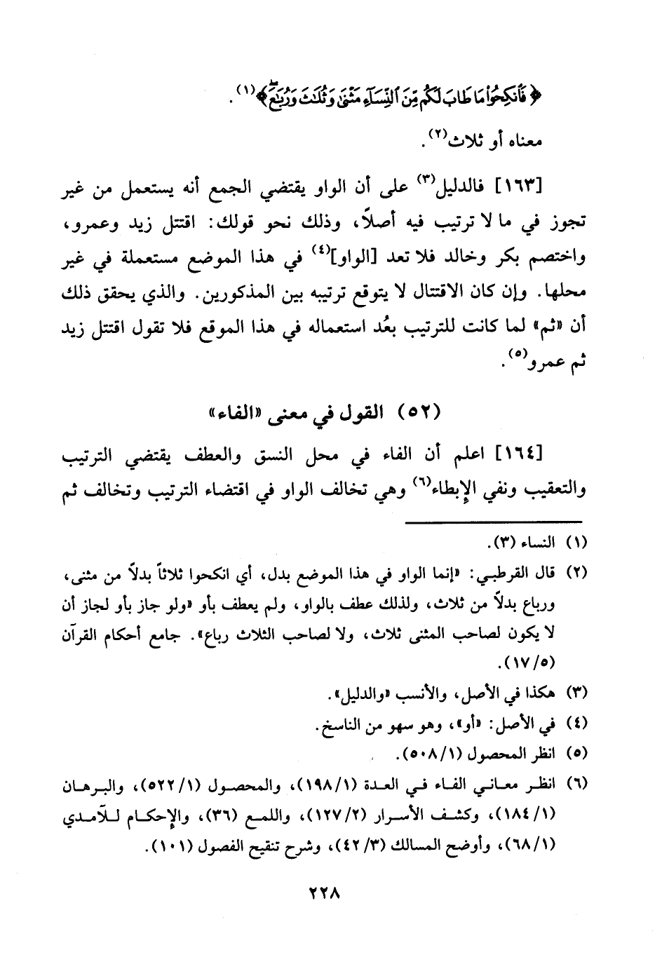 [164] اعْلَم أَن الْفَاء فِي مَحل النسق والعطف يَقْتَضِي التَّرْتِيب والتعقيب وَنفي الإبطاء وَهِي تخَالف الْوَاو فِي اقْتِضَاء التَّرْتِيب وتخالف ثمَّ
