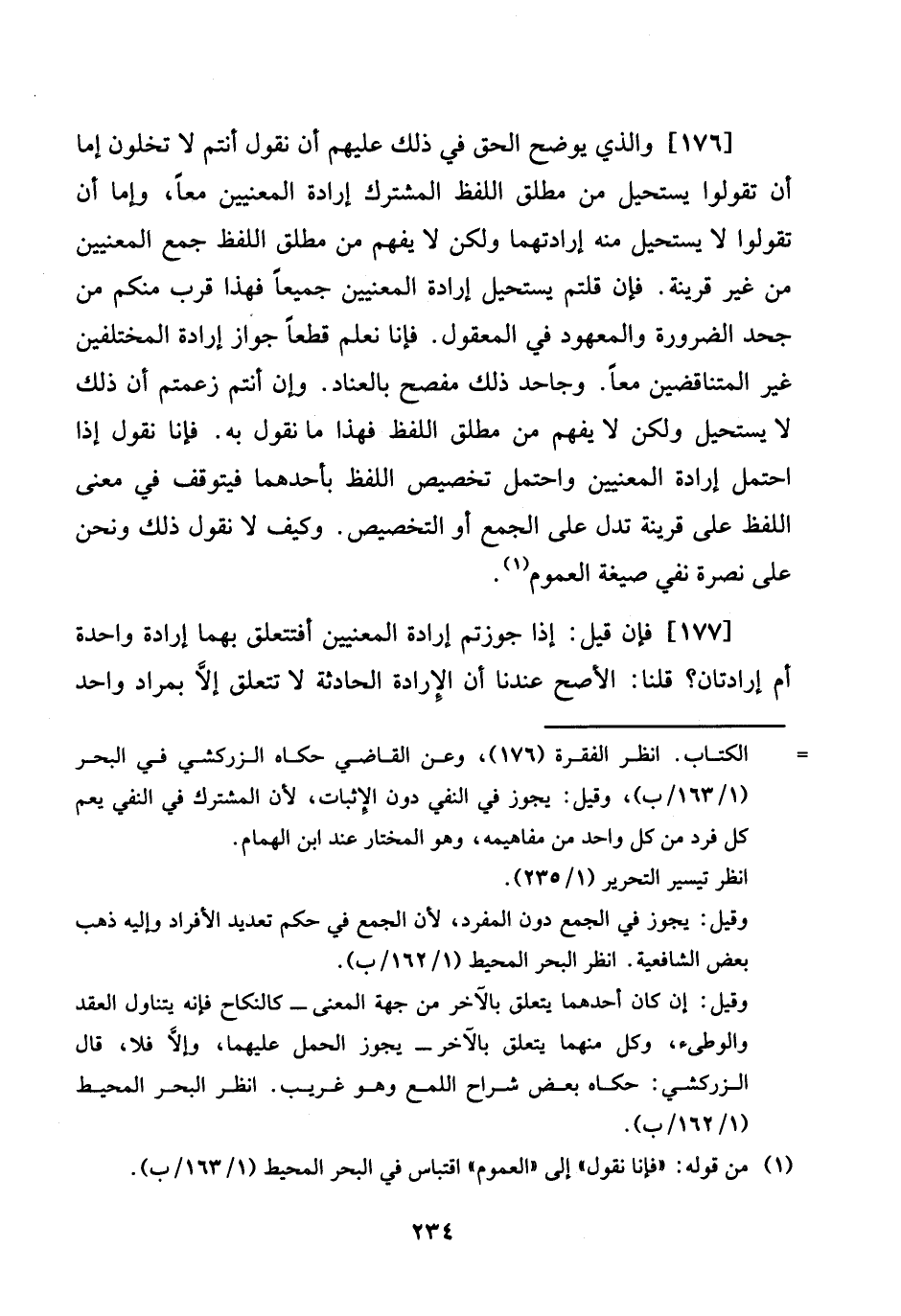 [176] وَالَّذِي يُوضح الْحق فِي ذَلِك عَلَيْهِم أَن نقُول أَنْتُم لَا تخلون إِمَّا أَن تَقولُوا يَسْتَحِيل من مُطلق اللَّفْظ الْمُشْتَرك إِرَادَة الْمَعْنيين مَعًا، وَإِمَّا أَن تَقولُوا لَا يَسْتَحِيل مِنْهُ إرادتهما وَلَكِن لَا يفهم من مُطلق اللَّفْظ جمع الْمَعْنيين من غير قرينَة. فَإِن قُلْتُمْ يَسْتَحِيل إِرَادَة الْمَعْنيين جَمِيعًا فَهَذَا قرب مِنْكُم من جحد الضَّرُورَة والمعهود فِي الْمَعْقُول. فَإنَّا نعلم قطعا جَوَاز إِرَادَة الْمُخْتَلِفين غير المتناقضين مَعًا. وجاحد ذَلِك مفصح بالعناد. وَإِن أَنْتُم زعمتم أَن ذَلِك لَا يَسْتَحِيل وَلَكِن لَا يفهم من مُطلق اللَّفْظ فَهَذَا مَا نقُول بِهِ. فَإنَّا نقُول إِذا احْتمل إِرَادَة الْمَعْنيين وَاحْتمل تَخْصِيص اللَّفْظ بِأَحَدِهِمَا فَيتَوَقَّف فِي معنى اللَّفْظ على قرينَة تدل على الْجمع أَو التَّخْصِيص. وَكَيف لَا نقُول ذَلِك وَنحن على نصْرَة نفي صِيغَة الْعُمُوم.