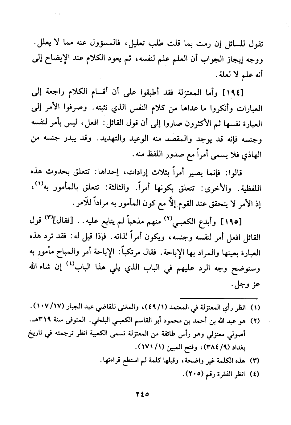 [194] وَأما الْمُعْتَزلَة فقد أطبقوا على أَن أَقسَام الْكَلَام رَاجِعَة إِلَى الْعبارَات وأنكروا مَا عَداهَا من كَلَام النَّفس الَّذِي نثبته. وصرفوا الْأَمر إِلَى الْعبارَة نَفسهَا ثمَّ الْأَكْثَرُونَ صَارُوا إِلَى أَن قَول الْقَائِل: افْعَل، لَيْسَ بِأَمْر لنَفسِهِ وجنسه فَإِنَّهُ قد يُوجد والمقصد مِنْهُ الْوَعيد والتهديد. وَقد يبدر جنسه من الهاذي فَلَا يُسمى أمرا مَعَ صُدُور اللَّفْظ مِنْهُ.