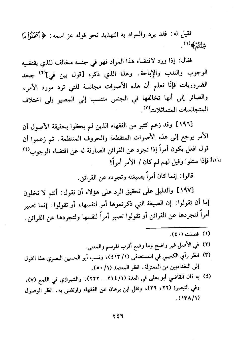 [196] وَقد زعم كثير من الْفُقَهَاء الَّذين لم يحظوا بِحَقِيقَة الْأُصُول أَن الْأَمر يرجع إِلَى هَذِه الْأَصْوَات المتقطعة والحروف المنتظمة. ثمَّ زَعَمُوا أَن قَول افْعَل يكون أمرا إِذا تجرد عَن الْقَرَائِن الصارفة لَهُ عَن اقْتِضَاء الْوُجُوب [21 / أ] فَإِذا سئلوا وَقيل لَهُم لم كَانَ / الْأَمر أمرا؟