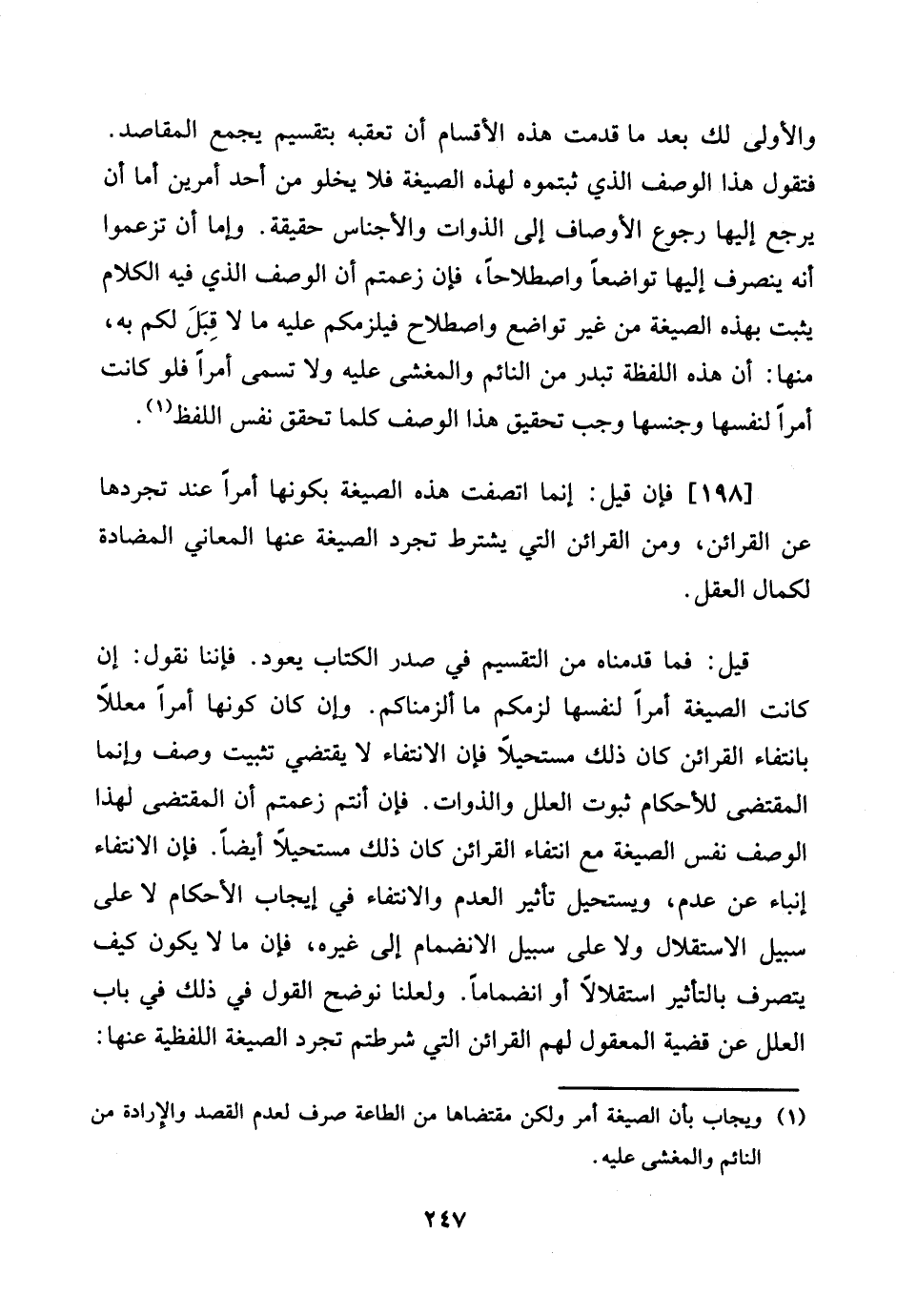 وَالْأولَى لَك بعد مَا قدمت هَذِه الْأَقْسَام أَن تعقبه بتقسيم يجمع الْمَقَاصِد. فَتَقول هَذَا الْوَصْف الَّذِي ثبتموه لهَذِهِ الصِّيغَة فَلَا يَخْلُو من أحد أَمريْن أما أَن يرجع إِلَيْهَا رُجُوع الْأَوْصَاف إِلَى الذوات والأجناس حَقِيقَة. وَإِمَّا أَن تزعموا أَنه ينْصَرف إِلَيْهَا تواضعا وَاصْطِلَاحا، فَإِن زعمتم أَن الْوَصْف الَّذِي فِيهِ الْكَلَام يثبت بِهَذِهِ الصِّيغَة من غير تواضع واصطلاح فيلزمكم عَلَيْهِ مَا لَا قبل لكم بِهِ، مِنْهَا: أَن هَذِه اللَّفْظَة تبدر من النَّائِم والمغشى عَلَيْهِ وَلَا تسمى أمرا فَلَو كَانَت أمرا لنَفسهَا وجنسها وَجب تَحْقِيق هَذَا الْوَصْف كلما تحقق نَفسه اللَّفْظ.