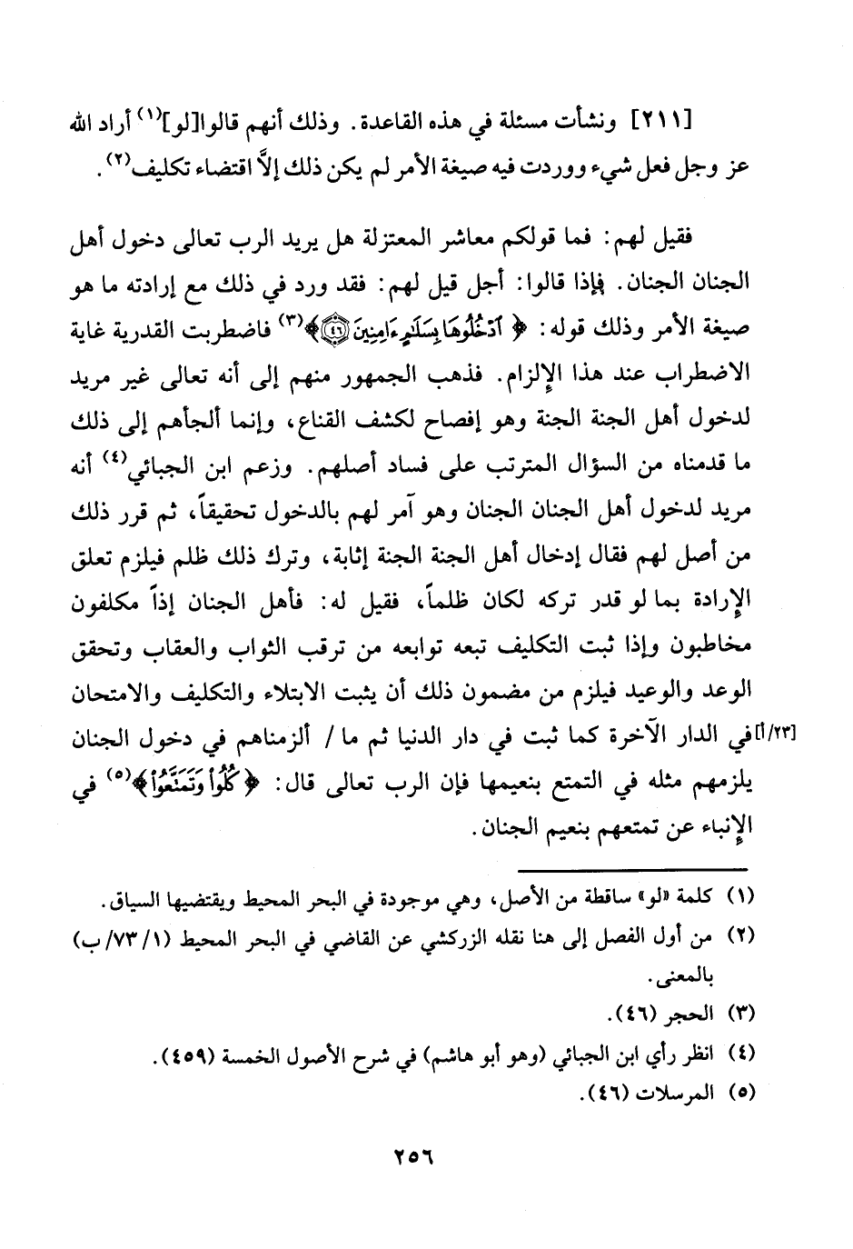 فَقيل لَهُم: فَمَا قَوْلكُم معاشر الْمُعْتَزلَة هَل يُرِيد الرب تَعَالَى دُخُول أهل الْجنان الْجنان. فَإِذا قَالُوا: أجل قيل لَهُم: فقد ورد فِي ذَلِك مَعَ إِرَادَته مَا هُوَ صِيغَة الْأَمر وَذَلِكَ قَوْله: {ادخلوها بِسَلام آمِنين} فاضطربت الْقَدَرِيَّة غَايَة الِاضْطِرَاب عِنْد هَذَا الْإِلْزَام. فَذهب الْجُمْهُور مِنْهُم إِلَى أَنه تَعَالَى غير مُرِيد لدُخُول أهل الْجنَّة الْجنَّة وَهُوَ إفصاح لكشف القناع، وَإِنَّمَا ألجأهم إِلَى ذَلِك مَا قدمْنَاهُ من السُّؤَال الْمُتَرَتب على فَسَاد أصلهم. وَزعم ابْن الجبائي أَنه مُرِيد لدُخُول أهل الْجنان الْجنان وَهُوَ آمُر لَهُم بِالدُّخُولِ تَحْقِيقا، ثمَّ قرر ذَلِك من أصل لَهُم فَقَالَ إِدْخَال أهل الْجنَّة الْجنَّة إثابة، وَترك ذَلِك ظلم فَيلْزم تعلق الْإِرَادَة بِمَا لَو قدر تَركه لَكَانَ ظلما، فَقيل لَهُ: فَأهل الْجنان إِذا مكلفون مخاطبون وَإِذا ثَبت التَّكْلِيف تبعه توابعه من ترقب الثَّوَاب وَالْعِقَاب وَتحقّق الْوَعْد والوعيد فَيلْزم من مَضْمُون ذَلِك أَن يثبت الِابْتِلَاء والتكليف والامتحان [23 / أ] فِي الدَّار الْآخِرَة كَمَا ثَبت فِي دارالدنيا ثمَّ مَا / ألزمناهم فِي دُخُول الْجنان يلْزمهُم مثله فِي التَّمَتُّع بنعيمها فَإِن الرب تَعَالَى قَالَ: {كلوا وتمتعوا} فِي الإنباء عَن تمتعهم بنعيم الْجنان.