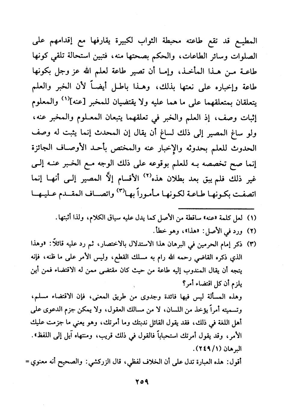 الْمُطِيع قد تقع طَاعَته محبطة الثَّوَاب لكبيرة يقارفها مَعَ إقدامهم على الصَّلَوَات وَسَائِر الطَّاعَات، وَالْحكم بِصِحَّتِهَا مِنْهُ، فَتبين اسْتِحَالَة تلقي كَونهَا طَاعَة من هَذَا المأخذ، وَإِمَّا أَن تصير طَاعَة لعلم الله عز وَجل بِكَوْنِهَا طَاعَة وإخباره على نعتها بذلك، وَهَذَا بَاطِل أَيْضا لِأَن الْخَبَر وَالْعلم يتعلقان بمتعلقهما على مَا هما عَلَيْهِ وَلَا يقتضيان للمخبر [عَنهُ] والمعلوم إِثْبَات وصف، إِذْ الْعلم وَالْخَبَر فِي تعلقهما يتبعان الْمَعْلُوم والمخبر عَنهُ، وَلَو سَاغَ الْمصير إِلَى ذَلِك لساغ أَن يُقَال إِن الْمُحدث إِنَّمَا يثبت لَهُ وصف الْحُدُوث للْعلم بحدوثه والإخبار عَنهُ والمختص بِأحد الْأَوْصَاف الْجَائِزَة إِنَّمَا صَحَّ تخصصه بِهِ للْعلم بِوُقُوعِهِ على ذَلِك الْوَجْه مَعَ الْخَبَر عَنهُ إِلَى غير ذَلِك فَلم يبْق بعد بطلَان هَذِه الْأَقْسَام إِلَّا الْمصير إِلَى أَنَّهَا إِنَّمَا اتصفت بِكَوْنِهَا طَاعَة لكَونهَا مَأْمُورا بهَا واتصاف الْمُقدم عَلَيْهَا