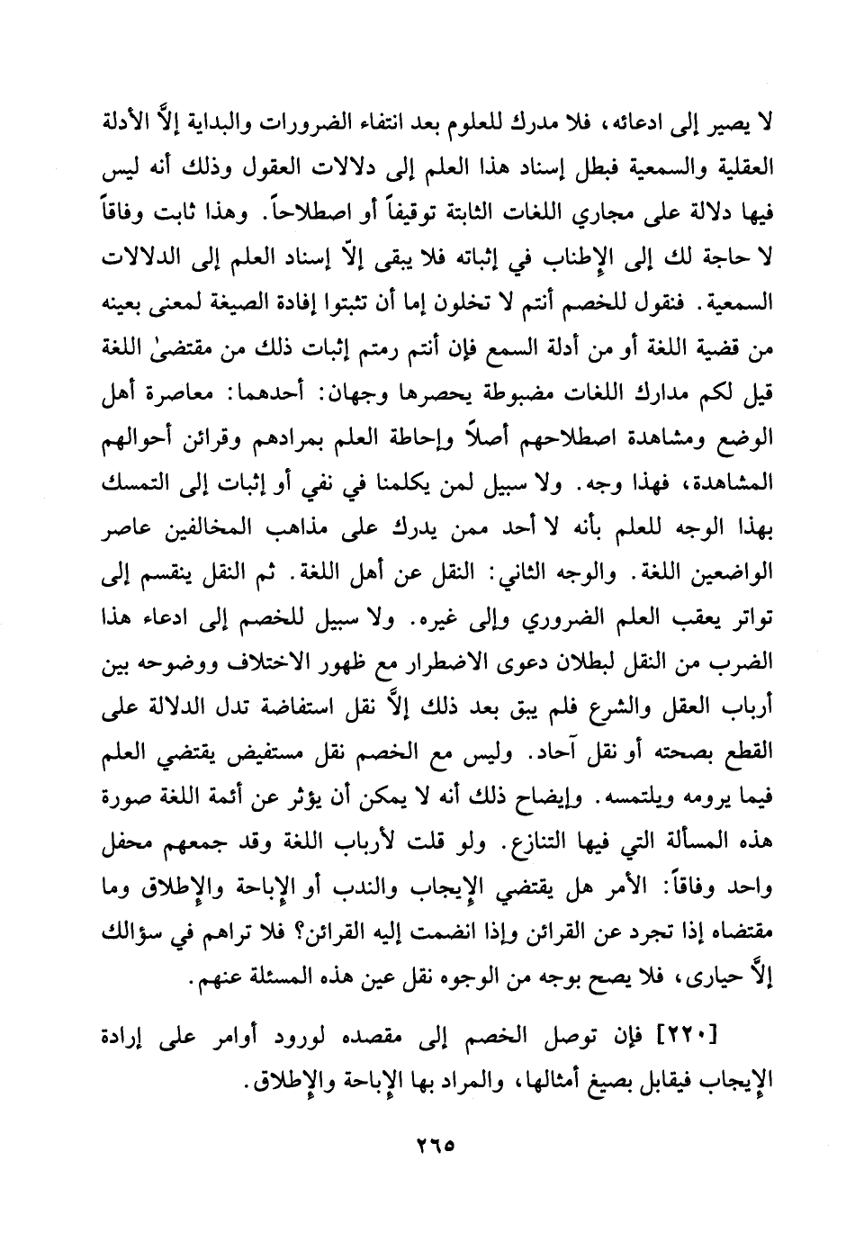 لَا يصير إِلَى إدعائه، فَلَا مدرك للعلوم بعد انْتِفَاء الضرورات والبداية إِلَّا الْأَدِلَّة الْعَقْلِيَّة والسمعية فَبَطل إِسْنَاد هَذَا الْعلم إِلَى دلالات الْعُقُول وَذَلِكَ أَنه لَيْسَ فِيهَا دلَالَة على مجاري اللُّغَات الثَّابِتَة توقيفا أَو اصْطِلَاحا. وَهَذَا ثَابت وفَاقا لَا حَاجَة لَك إِلَى الْأَطْنَاب فِي إثْبَاته فَلَا يبْقى إِلَّا إِسْنَاد الْعلم إِلَى الدلالات السمعية. فَنَقُول للخصم أَنْتُم لَا تخلون إِمَّا أَن تثبتوا إِفَادَة الصِّيغَة لِمَعْنى بِعَيْنِه من قَضِيَّة اللُّغَة أَو من أَدِلَّة السّمع فَإِن أَنْتُم رمتم إِثْبَات ذَلِك من مُقْتَضى اللُّغَة قيل لكم مدارك اللُّغَات مضبوطة يحصرها وَجْهَان: أَحدهمَا: معاصرة أهل الْوَضع ومشاهدة اصطلاحهم أصلا وإحاطة الْعلم بمرادهم وقرائن أَحْوَالهم الْمُشَاهدَة، فَهَذَا وَجه. وَلَا سَبِيل لمن يُكَلِّمنَا فِي نفي أَو إِثْبَات إِلَى التَّمَسُّك بِهَذَا الْوَجْه للْعلم بِأَنَّهُ لَا أحد مِمَّن يدْرك على مَذَاهِب الْمُخَالفين عاصر الواضعين اللُّغَة. وَالْوَجْه الثَّانِي: النَّقْل عَن أهل اللُّغَة. ثمَّ النَّقْل يَنْقَسِم إِلَى تَوَاتر يعقب الْعلم الضَّرُورِيّ وَإِلَى غَيره. وَلَا سَبِيل للخصم إِلَى ادِّعَاء هَذَا الضَّرْب من النَّقْل لبُطْلَان دَعْوَى الِاضْطِرَار مَعَ ظُهُور الِاخْتِلَاف ووضوحه بَين أَرْبَاب الْعقل وَالشَّرْع فَلم يبْق بعد ذَلِك إِلَّا نقل استفاضة تدل الدّلَالَة على الْقطع بِصِحَّتِهِ أَو نقل آحَاد. وَلَيْسَ مَعَ الْخصم نقل مستفيض يَقْتَضِي الْعلم فِيمَا يرومه ويلتمسه. وإيضاح ذَلِك أَنه لَا يُمكن أَن يُؤثر عَن أَئِمَّة اللُّغَة صُورَة هَذِه الْمَسْأَلَة الَّتِي فِيهَا التَّنَازُع. وَلَو قلت لأرباب اللُّغَة وَقد جمعهم محفل وَاحِد وفَاقا: الْأَمر هَل يَقْتَضِي الْإِيجَاب وَالنَّدْب أَو الْإِبَاحَة وَالْإِطْلَاق وَمَا مُقْتَضَاهُ إِذا تجرد عَن الْقَرَائِن وَإِذا انضمت إِلَيْهِ الْقَرَائِن؟ فَلَا تراهم فِي سؤالك إِلَّا حيارى، فَلَا يَصح بِوَجْه من الْوُجُوه نقل عين هَذِه المسئلة عَنْهُم.