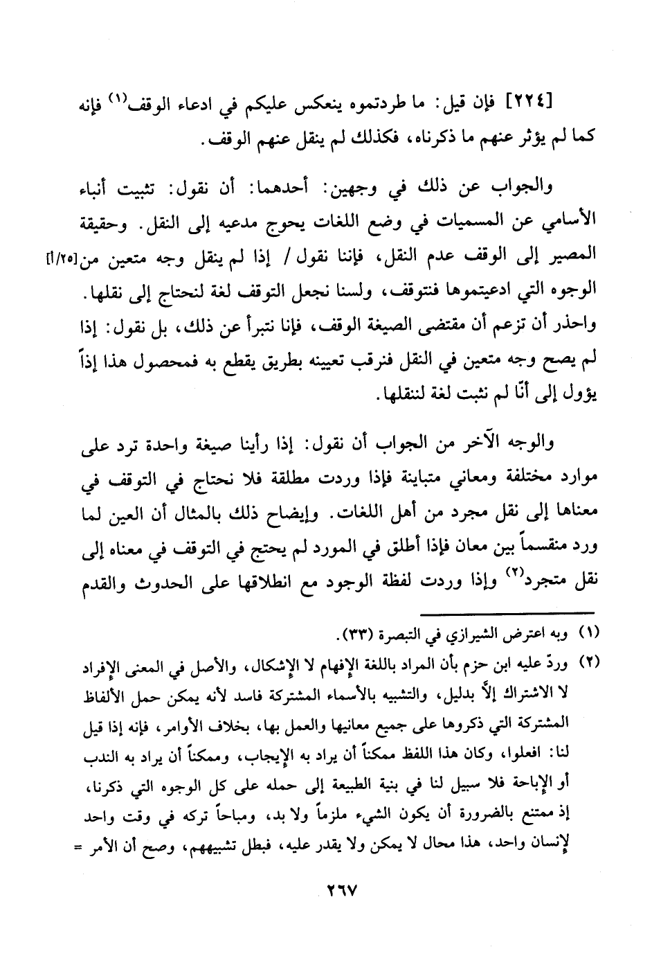 [224] فَإِن قيل: مَا طردتموه ينعكس عَلَيْكُم فِي ادِّعَاء الْوَقْف فَإِنَّهُ كَمَا لم يُؤثر عَنْهُم مَا ذَكرْنَاهُ، فَكَذَلِك لم ينْقل عَنْهُم الْوَقْف.