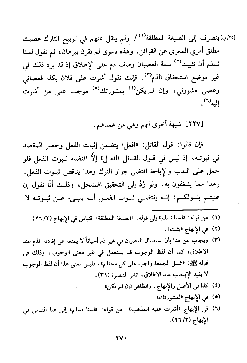 [25 / ب] ينْصَرف إِلَى الصِّيغَة الْمُطلقَة / وَلم ينْقل عَنْهُم فِي توبيخ التارك عصيت مُطلق أَمْرِي المعرى عَن الْقَرَائِن، وَهَذِه دَعْوَى لم تقرن ببرهان، ثمَّ نقُول لسنا نسلم أَن تثبيت سمة الْعِصْيَان وصف ذمّ على الْإِطْلَاق إِذْ قد يرد ذَلِك فِي غير مَوضِع اسْتِحْقَاق الذَّم. فَإنَّك تَقول أَشرت على فلَان بِكَذَا فعصاني وَعصى مشورتي، وَإِن لم يكن بمشورتك مُوجب على من أَشرت إِلَيْهِ.