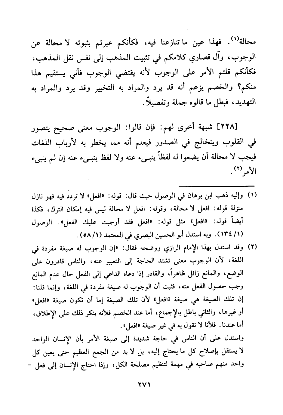 [228] شُبْهَة أُخْرَى لَهُم: فَإِن قَالُوا: الْوُجُوب معنى صَحِيح يتَصَوَّر فِي الْقُلُوب ويتخالج فِي الصُّدُور فَيعلم أَنه مِمَّا يخْطر بِهِ لأرباب اللُّغَات فَيجب لَا محَالة أَن يضعوا لَهُ لفظا يُنبئ عَنهُ وَلَا لفظ يُنبئ عَنهُ إِن لم يُنبئ الْأَمر.