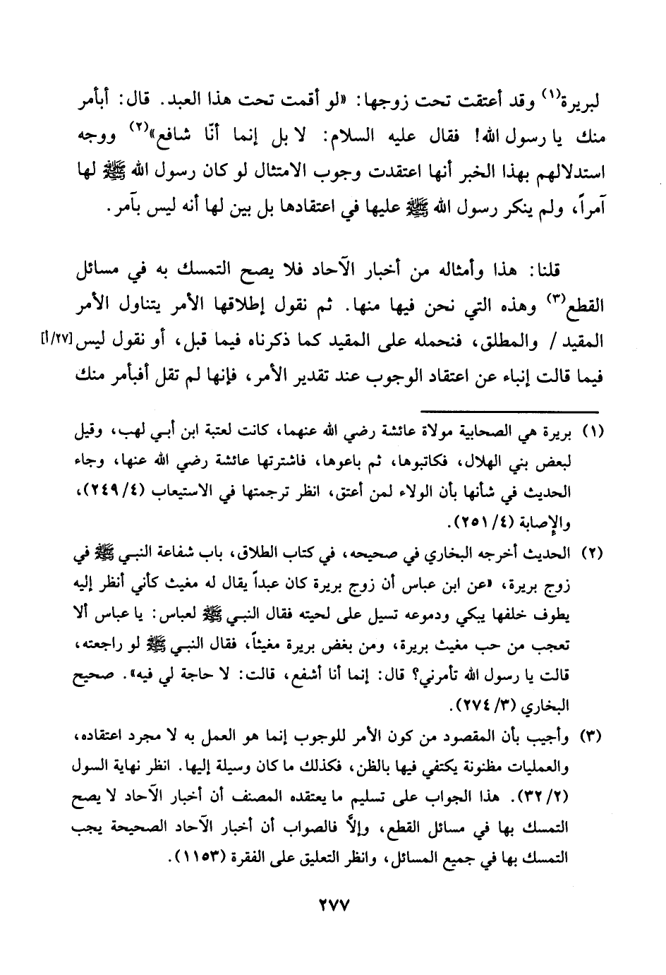 لبريرة وَقد أعتقت تَحت زَوجهَا: ((لَو أَقمت تَحت هَذَا العَبْد. قَالَ: أبأمر مِنْك يَا رَسُول الله! فَقَالَ عَلَيْهِ السَّلَام: لَا بل إِنَّمَا أَنا شَافِع)) وَوجه استدلالهم بِهَذَا الْخَبَر أَنَّهَا اعتقدت وجوب الِامْتِثَال لَو كَانَ رَسُول الله [صلى الله عَلَيْهِ وَسلم] لَهَا آمرا، وَلم يُنكر رَسُول الله [صلى الله عَلَيْهِ وَسلم] عَلَيْهَا فِي اعتقادها بل بَين لَهَا أَنه لَيْسَ بآمر.