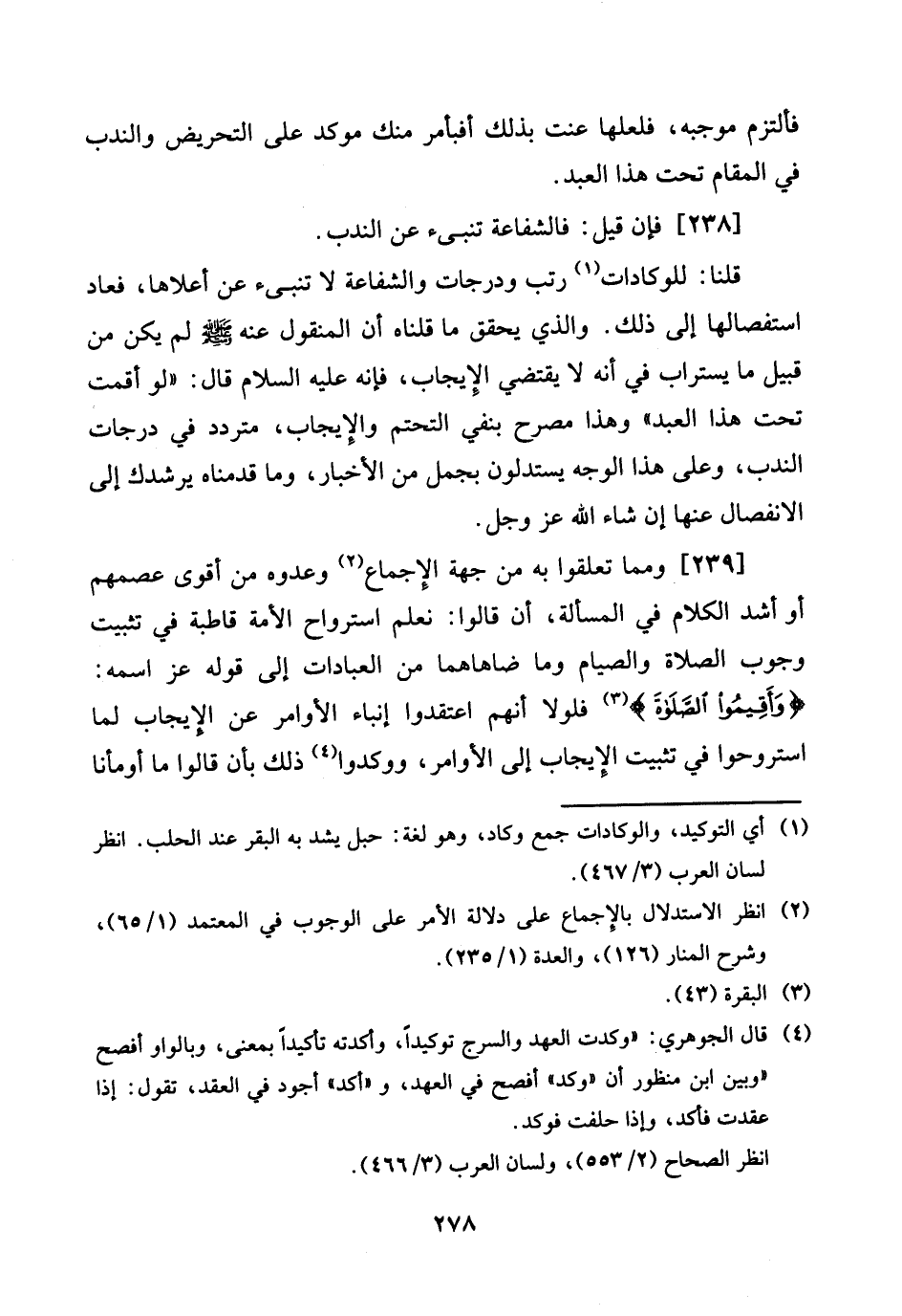 [239] وَمِمَّا تعلقوا بِهِ من جِهَة الْإِجْمَاع وعدوه من أقوى عصمهم أَو أَشد الْكَلَام فِي الْمَسْأَلَة، أَن قَالُوا: نعلم استرواح الْأمة قاطبة فِي تثبيت وجوب الصَّلَاة وَالصِّيَام وَمَا ضاهاهما من الْعِبَادَات إِلَى قَوْله عز اسْمه: {وَأقِيمُوا الصَّلَاة} فلولا أَنهم اعتقدوا إنباء الْأَوَامِر عَن الْإِيجَاب لما استروحوا فِي تثبيت الْإِيجَاب إِلَى الْأَوَامِر، ووكدوا ذَلِك بِأَن قَالُوا مَا أومأنا