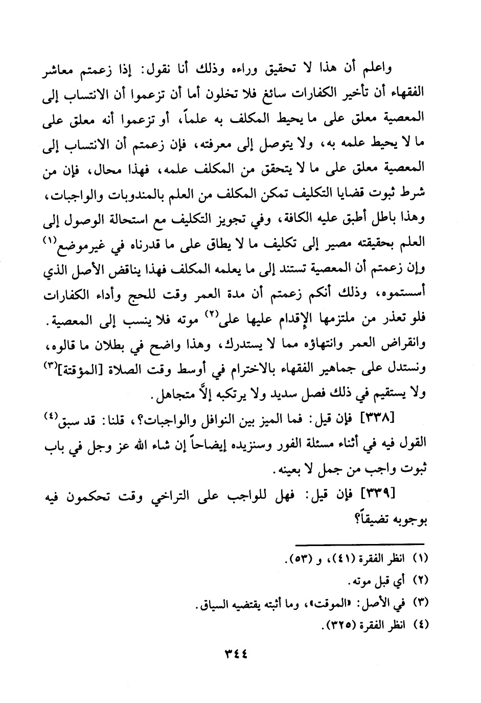 وَاعْلَم أَن هَذَا لَا تَحْقِيق وَرَاءه وَذَلِكَ أَنا نقُول: إِذا زعمتم معاشر الْفُقَهَاء أَن تَأْخِير الْكَفَّارَات سَائِغ فَلَا تخلون أما أَن تزعموا أَن الانتساب إِلَى المعصيبة مُعَلّق على مَا يُحِيط الْمُكَلف بِهِ علما، أَو تزعموا أَنه مُعَلّق على مَا لَا يُحِيط علمه بِهِ، وَلَا يتَوَصَّل إِلَى مَعْرفَته، فَإِن زعمتم أَن الانتساب إِلَى الْمعْصِيَة مُعَلّق على مَا لَا يتَحَقَّق من الْمُكَلف علمه، فَهَذَا محَال، فَإِن من شَرط ثُبُوت قضايا التَّكْلِيف تمكن الْمُكَلف من الْعلم بالمندوبات والواجبات، وَهَذَا بَاطِل أطبق عَلَيْهِ الكافة، وَفِي تَجْوِيز التَّكْلِيف مَعَ اسْتِحَالَة الْوُصُول إِلَى الْعلم بحقيقته مصير إِلَى تَكْلِيف مَا لَا يُطَاق على مَا قدرناه فِي غير مَوضِع وَإِن زعمتم أَن الْمعْصِيَة تستند إِلَى مَا يُعلمهُ الْمُكَلف فَهَذَا يُنَاقض الأَصْل الَّذِي أسستموه، وَذَلِكَ أَنكُمْ زعمتم أَن مُدَّة الْعُمر وَقت لِلْحَجِّ وَأَدَاء الْكَفَّارَات فَلَو تعذر من ملتزمها الْإِقْدَام عَلَيْهَا على مَوته فَلَا ينْسب إِلَى الْمعْصِيَة. وانقراض الْعُمر وانتهاؤه مِمَّا لَا يسْتَدرك، وَهَذَا وَاضح فِي بطلَان مَا قَالُوهُ، ونستدل على جَمَاهِير الْفُقَهَاء بالاخترام فِي أَوسط وَقت الصَّلَاة [المؤقتة] وَلَا يَسْتَقِيم فِي ذَلِك فصل سديد وَلَا يرتكبه إِلَّا متجاهل.