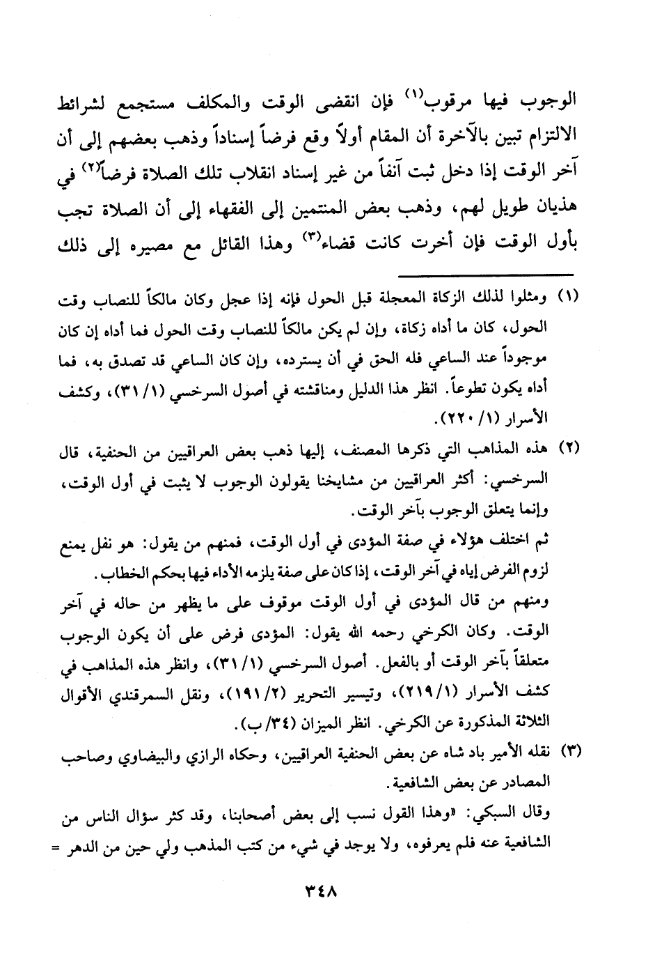 الْوُجُوب فِيهَا مرقوب فَإِن انْقَضى الْوَقْت والمكلف مستجمع لشرائط الِالْتِزَام تبين بِالْآخرِ أَن الْمقَام أَولا وَقع فرضا إِسْنَادًا وَذهب بَعضهم إِلَى أَن آخر الْوَقْت إِذا دخل ثَبت آنِفا من غير إِسْنَاد انقلاب تِلْكَ الصَّلَاة فرضا فِي هذيان طَوِيل لَهُم، وَذهب بعض المنتمين إِلَى الْفُقَهَاء إِلَى أَن الصَّلَاة تجب بِأول الْوَقْت فَإِن أخرت كَانَت قَضَاء وَهَذَا الْقَائِل مَعَ مصيره إِلَى ذَلِك