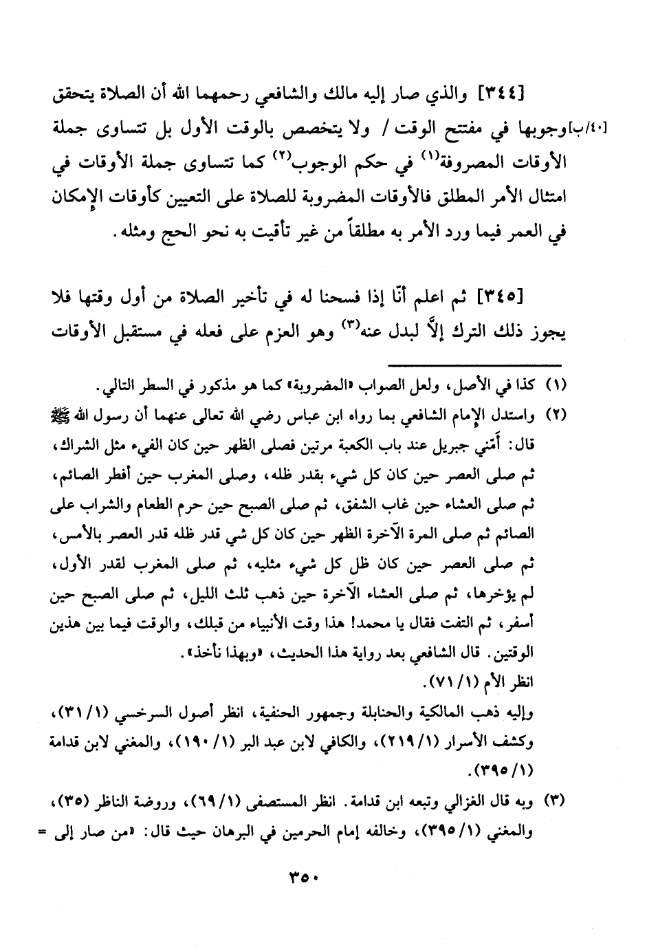 [344] وَالَّذِي صَار إِلَيْهِ مَالك وَالشَّافِعِيّ رحمهمَا الله أَن الصَّلَاة يتَحَقَّق [40 / ب] وُجُوبهَا فِي مفتتح الْوَقْت / وَلَا يتخصص بِالْوَقْتِ الأول بل تتساوى جملَة الْأَوْقَات المصروفة فِي حكم الْوُجُوب كَمَا تتساوى جملَة الْأَوْقَات فِي امْتِثَال الْأَمر الْمُطلق فالأوقات المضروبة للصَّلَاة على التَّعْيِين كأوقات الْإِمْكَان فِي الْعُمر فِيمَا ورد الْأَمر بِهِ مُطلقًا من غير تأقيت بِهِ نَحْو الْحَج وَمثله.