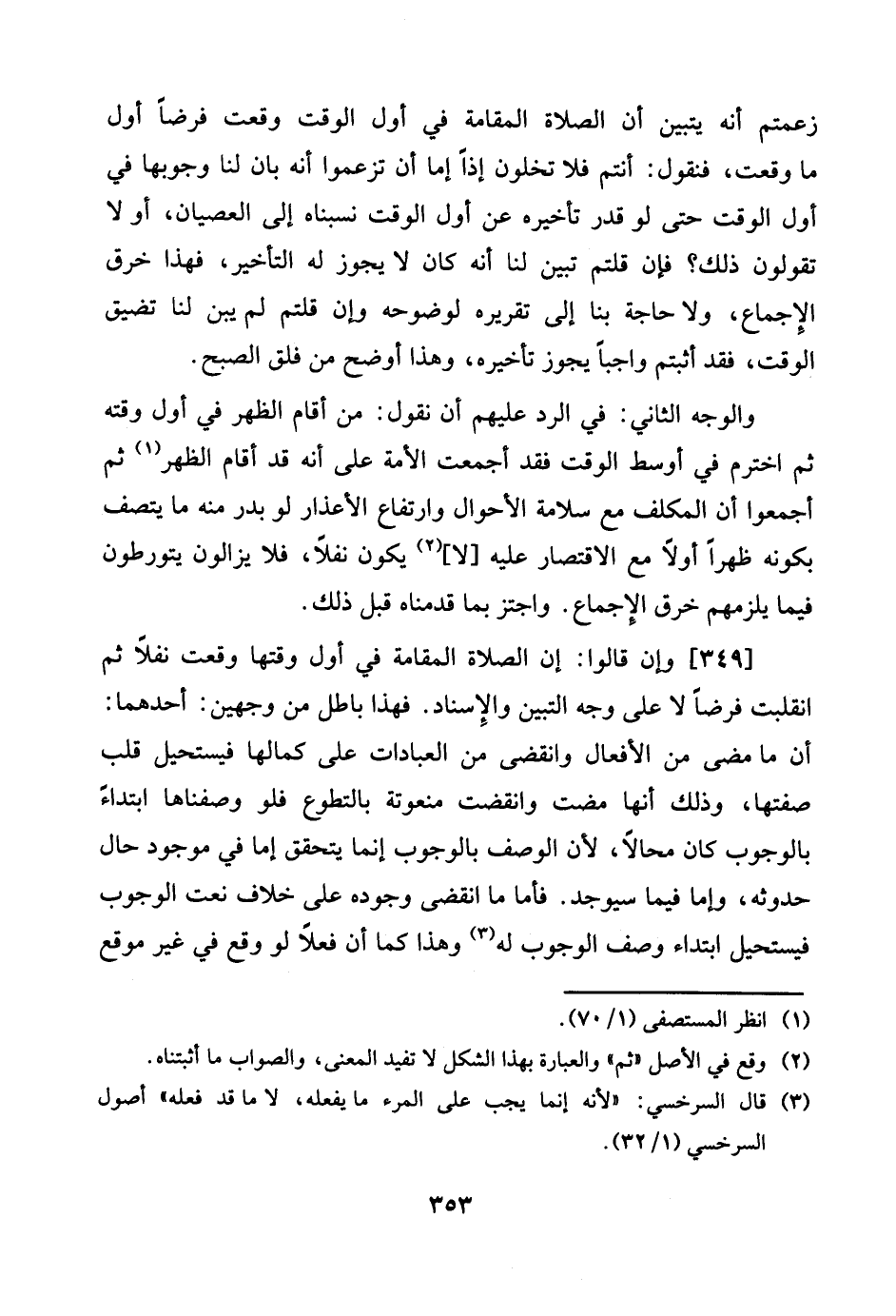 زعمتم أَنه يتَبَيَّن أَن الصَّلَاة المقامة فِي أول الْوَقْت وَقعت فرضا أول مَا وَقعت، فَنَقُول: أَنْتُم فَلَا تخلون إِذا إِمَّا أَن تزعموا أَنه بَان لنا وُجُوبهَا فِي أول الْوَقْت حَتَّى لَو قدر تَأْخِيره عَن أول الْوَقْت نسبناه إِلَى الْعِصْيَان، أَو لَا تَقولُونَ ذَلِك؟ فَإِن قُلْتُمْ تبين لنا أَنه كَانَ لَا يجوز لَهُ التَّأْخِير، فَهَذَا خرق الْإِجْمَاع، وَلَا حَاجَة بِنَا إِلَى تَقْرِيره لوضوحه وَإِن قُلْتُمْ لم يبن لنا تضيق الْوَقْت، فقد أثبتم وَاجِبا يجوز تَأْخِيره، وَهَذَا أوضح من فلق الصُّبْح.
