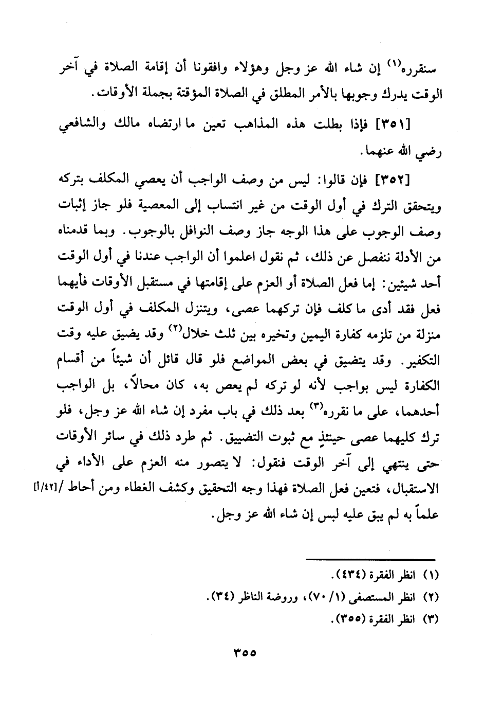 [352] فَإِن قَالُوا: لَيْسَ من وصف الْوَاجِب أَن يَعْصِي الْمُكَلف بِتَرْكِهِ ويتحقق التّرْك فِي أول الْوَقْت من غير انتساب إِلَى الْمعْصِيَة فَلَو جَازَ إِثْبَات وصف الْوُجُوب على هَذَا الْوَجْه جَازَ وصف النَّوَافِل بِالْوُجُوب. وَبِمَا قدمْنَاهُ من الْأَدِلَّة ننفصل عَن ذَلِك، ثمَّ نقُول اعلموا أَن الْوَاجِب عندنَا فِي أول الْوَقْت أحد شَيْئَيْنِ: إِمَّا فعل الصَّلَاة أَو الْعَزْم على إِقَامَتهَا فِي مُسْتَقْبل الْأَوْقَات فَأَيّهمَا فعل فقد أدّى مَا كلف فَإِن تَركهمَا عصى، ويتنزل الْمُكَلف فِي أول الْوَقْت منزلَة من تلْزمهُ كَفَّارَة الْيَمين وتخيره بَين ثلث خلال وَقد يضيق عَلَيْهِ وَقت التَّكْفِير. وَقد يتضيق فِي بعض الْمَوَاضِع فَلَو قَالَ قَائِل أَن شَيْئا من أَقسَام الْكَفَّارَة لَيْسَ بِوَاجِب لِأَنَّهُ لَو تَركه لم يعْص بِهِ، كَانَ محالا، بل الْوَاجِب أَحدهمَا، على مَا نقرره بعد ذَلِك فِي بَاب مُفْرد إِن شَاءَ الله عز وَجل، فَلَو ترك كليهمَا عصى حِينَئِذٍ مَعَ ثُبُوت التَّضْيِيق. ثمَّ طرد ذَلِك فِي سَائِر الْأَوْقَات حَتَّى يَنْتَهِي إِلَى آخر الْوَقْت فَنَقُول: لَا يتَصَوَّر مِنْهُ الْعَزْم على الْأَدَاء فِي الِاسْتِقْبَال، فَتعين فعل الصَّلَاة فَهَذَا وَجه التَّحْقِيق وكشف الغطاء وَمن أحَاط / [42 / أ] علما بِهِ لم يبْق عَلَيْهِ لبس إِن شَاءَ الله عز وَجل.
