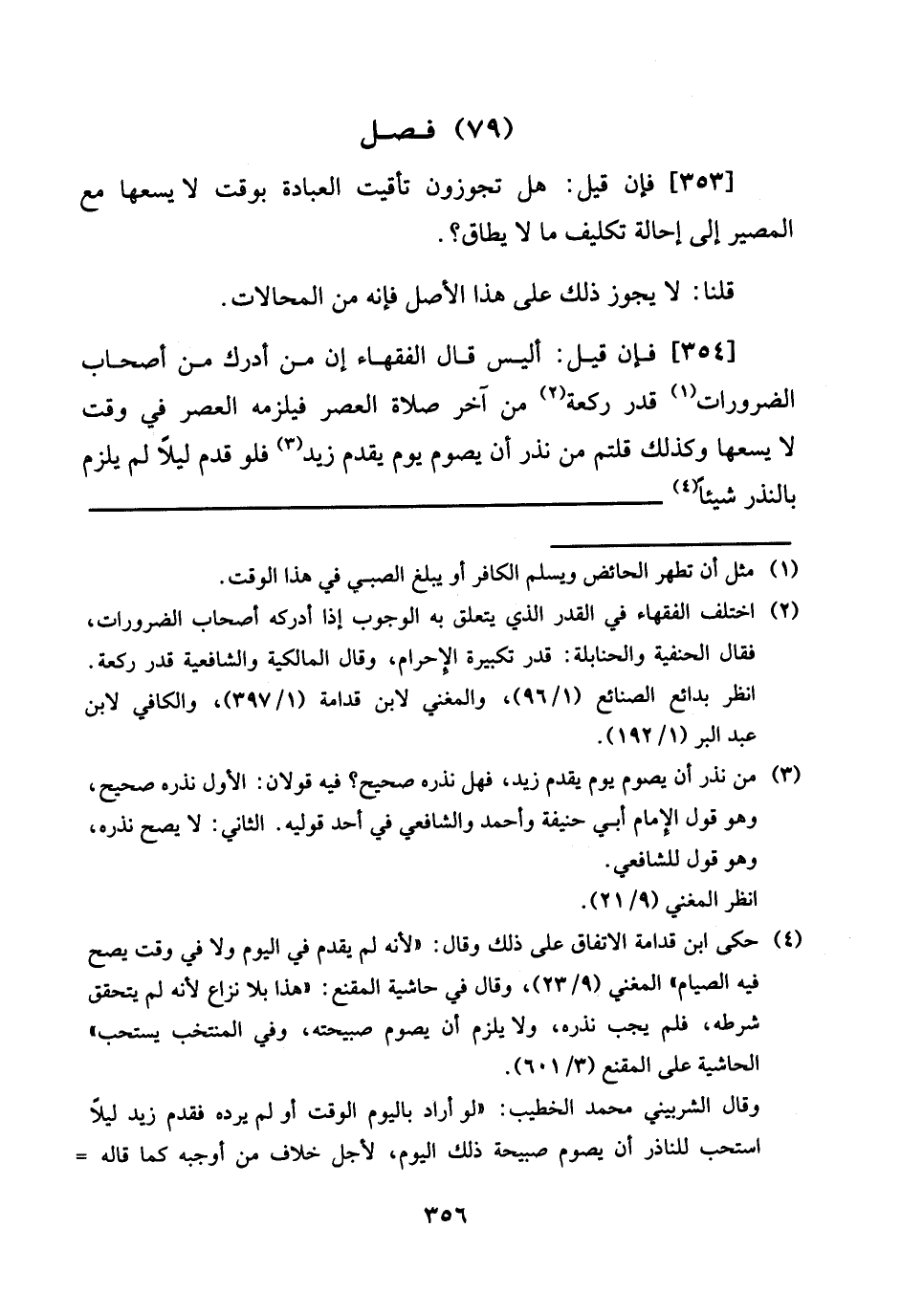 [354] فَإِن قيل: أَلَيْسَ قَالَ الْفُقَهَاء إِن من أدْرك من أَصْحَاب الضرورات قدر رَكْعَة من آخر صَلَاة الْعَصْر فَيلْزمهُ الْعَصْر فِي وَقت لَا يَسعهَا وَكَذَلِكَ قُلْتُمْ من نذر أَن يَصُوم يَوْم يقدم زيد فَلَو قدم لَيْلًا لم يلْزم بِالنذرِ شَيْئا