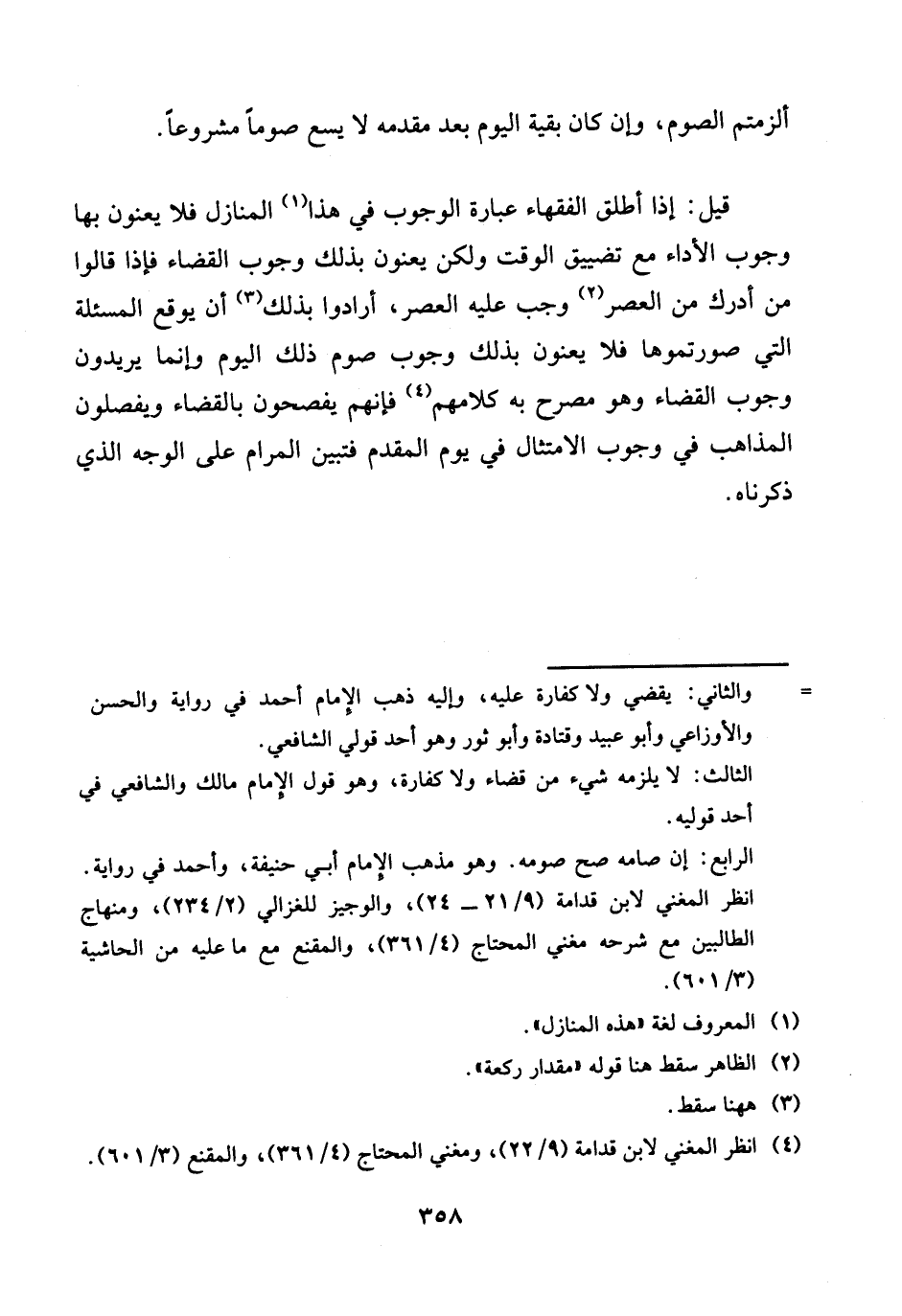 قيل: إِذا أطلق الْفُقَهَاء عبارَة الْوُجُوب فِي هَذَا الْمنَازل فَلَا يعنون بهَا وجوب الْأَدَاء مَعَ تضييق الْوَقْت وَلَكِن يعنون بذلك وجوب الْقَضَاء فَإِذا قَالُوا من أدْرك من الْعَصْر وَجب عَلَيْهِ الْعَصْر، أَرَادوا بذلك أَو يُوقع المسئلة الَّتِي صورتموها فَلَا يعنون بذلك وجوب صَوْم ذَلِك الْيَوْم وَإِنَّمَا يُرِيدُونَ وجوب الْقَضَاء وَهُوَ مُصَرح بِهِ كَلَامهم فَإِنَّهُم يفصحون بِالْقضَاءِ ويفصلون الْمذَاهب فِي وجوب الِامْتِثَال فِي يَوْم الْمُقدم فَتبين المرام على الْوَجْه الَّذِي ذَكرْنَاهُ.