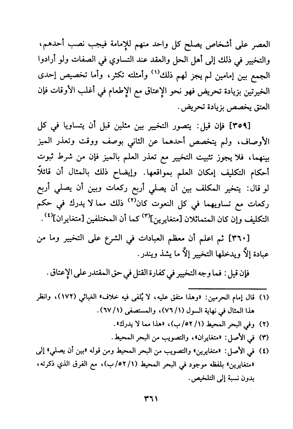 [360] ثمَّ اعْلَم أَن مُعظم الْعِبَادَات فِي الشَّرْع على التَّخْيِير وَمَا من عبَادَة إِلَّا ويدخلها التَّخْيِير إِلَّا مَا يشذ ويندر.